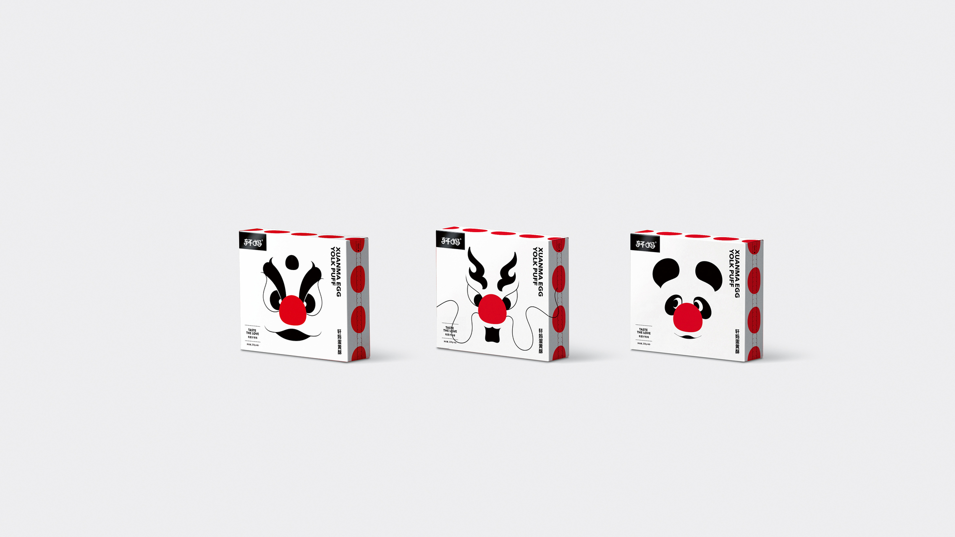 The packaging design for “Xuanma” biscuits places the main ingredient of egg yolk centre stage as a visual element, creating eye-catching images. In the form of a red dot, the egg yolk becomes a symbol which, depending on the packaging, graphically interacts with the sketched images of giant pandas, monkeys, dragons and lions. The inspiration for their facial expressions came from the facial changes of Chinese drama characters during performances. Since the meaning of the egg yolk symbol remains ambiguous, it leaves ample leeway for individual associations.