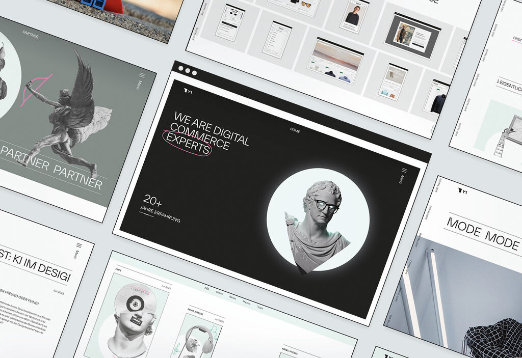 Y1 is an agency that has been developing bespoke e-commerce solutions for its clients for over 20 years now, with the central aim of combining analogue and digital elements as seamlessly as possible. The brand relaunch has put this approach at the forefront of the agency’s communication and visuals. Thus, the new claim “Digital Love” expresses the apparent contradiction between technology and emotion, between the analogue and the digital realm. This play on contrasts also defines the visual identity: whereas the black-and-white logo is pared back and functional, collages, luminous colours and sparingly used complementary accent colours play an important role in the brand communication by generating attention, excitement and visibility.