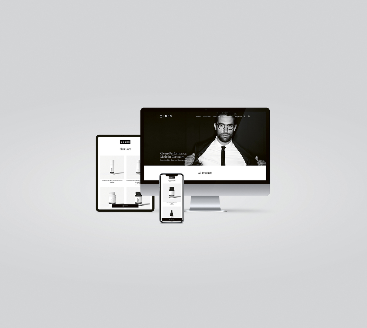 Founded in Berlin in 2019, YUNOS produces and sells skincare products and dietary supplements for men. The brand name YUNOS is an amalgamation of different notions. The Y illustrates the various decisions one has to make at the forks in life. The letter U stands for the English “you”, while NOS is derived from the Spanish word for “us”. These letters aim at expressing the deep and trusting connection between consumers and the brand. In addition, the letter Y also serves as a concise trademark. The products of the brand are all developed and manufactured in Germany and are free of any potentially harmful ingredients. This uncompromising philosophy is vividly expressed by the claim “Clean Performance for Men”. All products, their packaging and communication media are crafted in-house. The design language combines classic design elements with contemporary qualities to form a minimal and focused brand appearance that projects vibrancy and self-confidence. The black colour embodies the aspect of “Performance”, while white is intuitively associated to symbolise “Clean” in terms of purity. The expressive packaging design successfully visualises the brand’s character flexibly across various shapes and materials, thereby creating a uniform brand appearance with a high level of brand recognition. The products are only distributed online. This makes the YUNOS online shop the major consumer touchpoint with the brand. The shop was designed using a mobile-first approach to cater to the fact that most purchases are today made from mobile devices. Large product and lifestyle images mirror the brand’s core elements of self-confidence and sophistication. Social media channels in particular are mainly used to attract the attention of customers, to engage them in a meaningful dialogue and thus to achieve lasting customer loyalty.