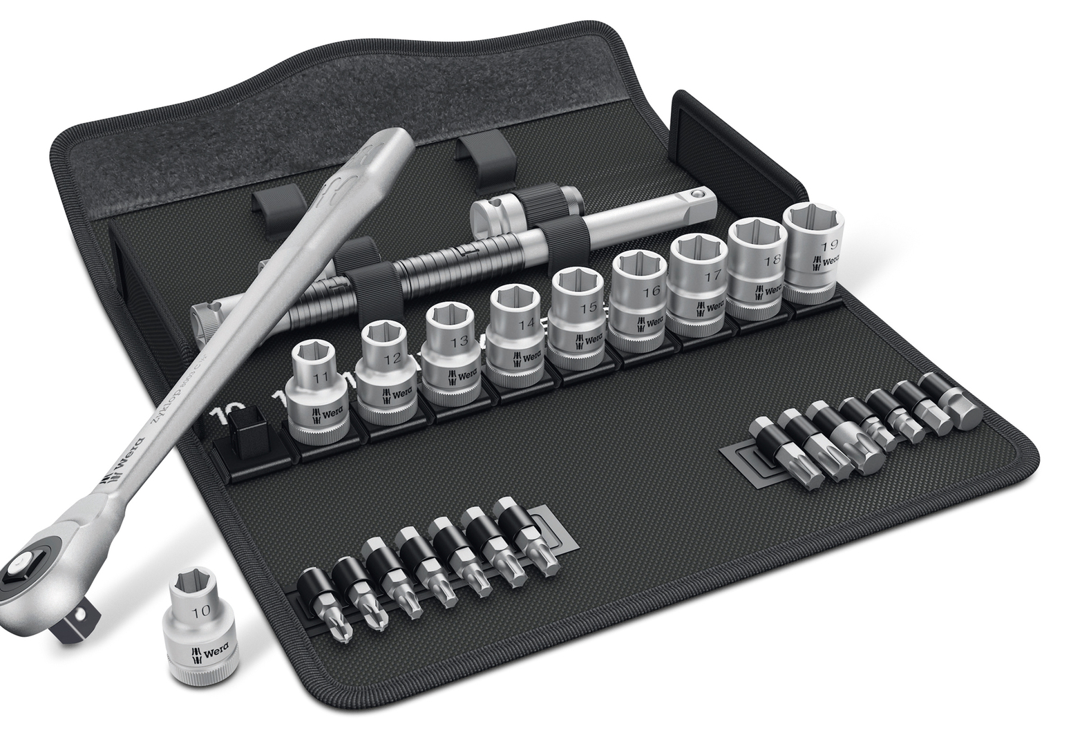 Der Zyklop-Metal-Satz ist aus geschmiedetem Vollmetall gefertigt. Die Knarre ist extrem schlank und verfügt über einen langen Hebel. Die Nussverriegelungsfunktion verhindert das ungewollte Lösen der Nuss. Das Werkzeug samt Zubehör wird in einer textilen Box geliefert, die sehr viel weniger wiegt als ein Metallkasten. Dadurch ist der Satz leichter zu transportieren.