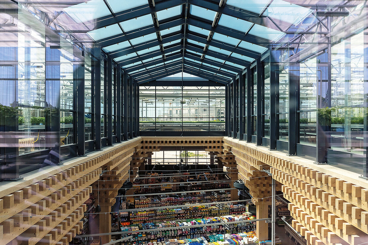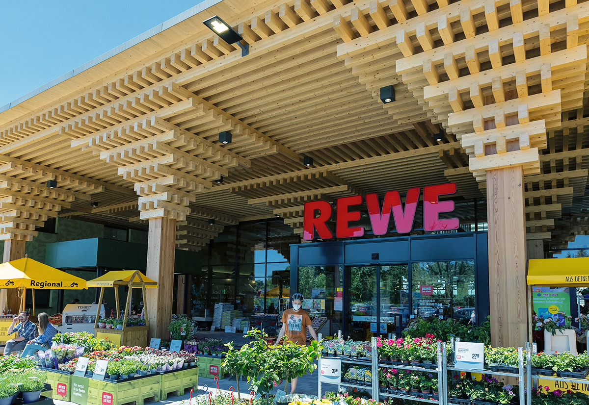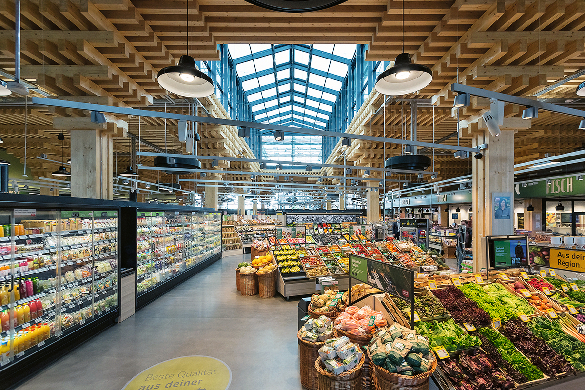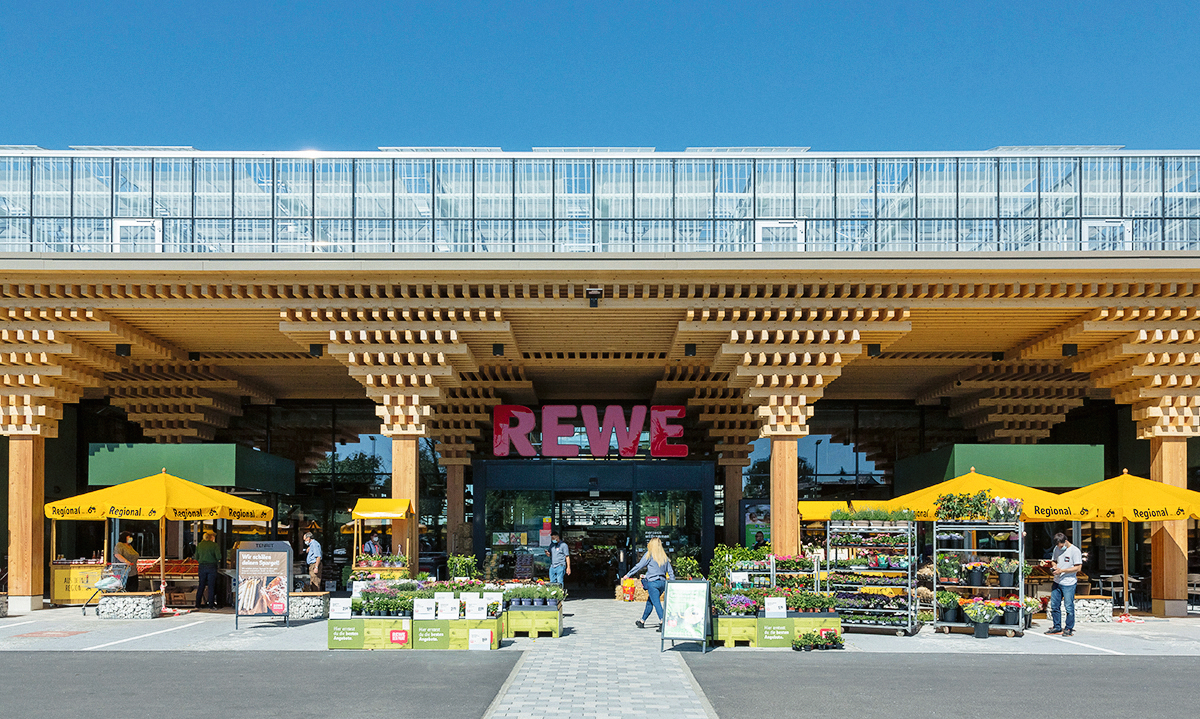 Holz ist vor dem Hintergrund der Klimakrise sicher ein wichtiger und nachhaltiger Baustoff der Zukunft. Es eignet sich zudem besonders gut für die Modularisierung – je nach Objekt können die Bauteile vollständig oder teilweise eingesetzt werden. Das entspricht auch dem Cradle to Cradle-Prinzip: Das Material wird über die Lebensdauer eines Gebäudes im Stoffkreislauf gehalten. Wenn dies gelingt und wir Holz aus nachhaltiger Forstwirtschaft verwenden, können unsere Gebäude CO2-Speicher sein. Beim REWE-Pilotmarkt in Wiesbaden wurden rund 1.100 Kubikmeter heimisches Nadelholz verbaut, wodurch über 700 Tonnen CO2 eingespeichert werden. In 30 Jahren ist das Holz wieder nachgewachsen und die CO2-Bilanz ausgeglichen. Darüber hinaus tragen intelligente Kühl- und Wärmetechnik, 100 Prozent Grünstrom sowie die Verwendung von Regenwasser für die Dachfarm, Sanitäranlagen und Reinigung des Marktes zur Ressourcenschonung bei.