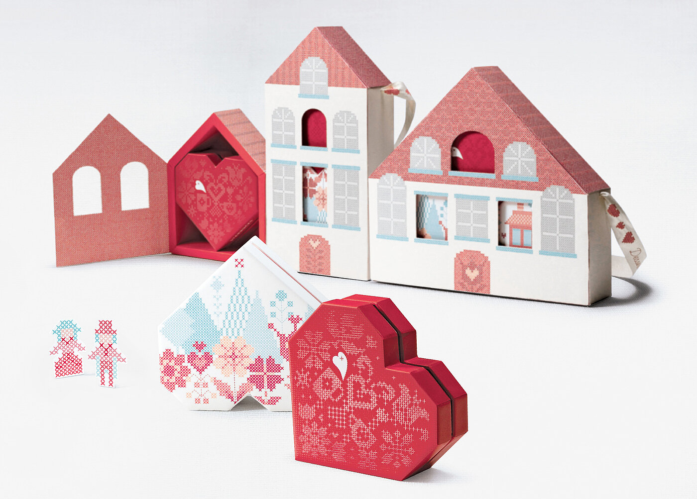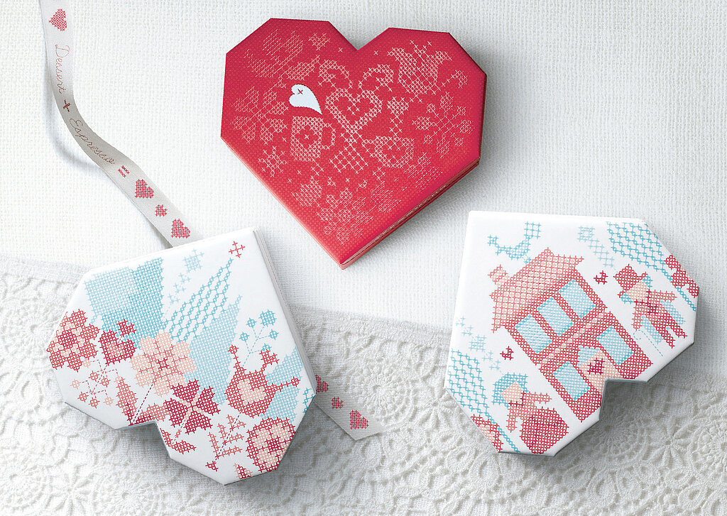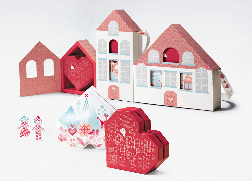 For Valentine’s Day, Starbucks Coffee Korea created chocolate packaging that honours traditional gifting while adding a modern twist: Valentine’s Day Chocolates. Outer boxes shaped like houses encase angular, cross-stitch–inspired heart boxes, with cut-out windows offering a playful preview. Embossed and spot-varnished patterns enhance tactility, and lined up, the boxes form a quaint Belgian village, reflecting the origin of the premium chocolates inside. The design combines symbolism, craftsmanship, and sensory experience, updating the familiar ritual of giving for contemporary audiences and was awarded a Red Dot in 2015.