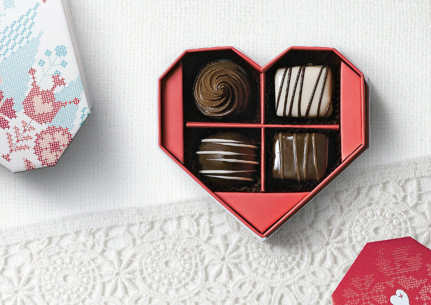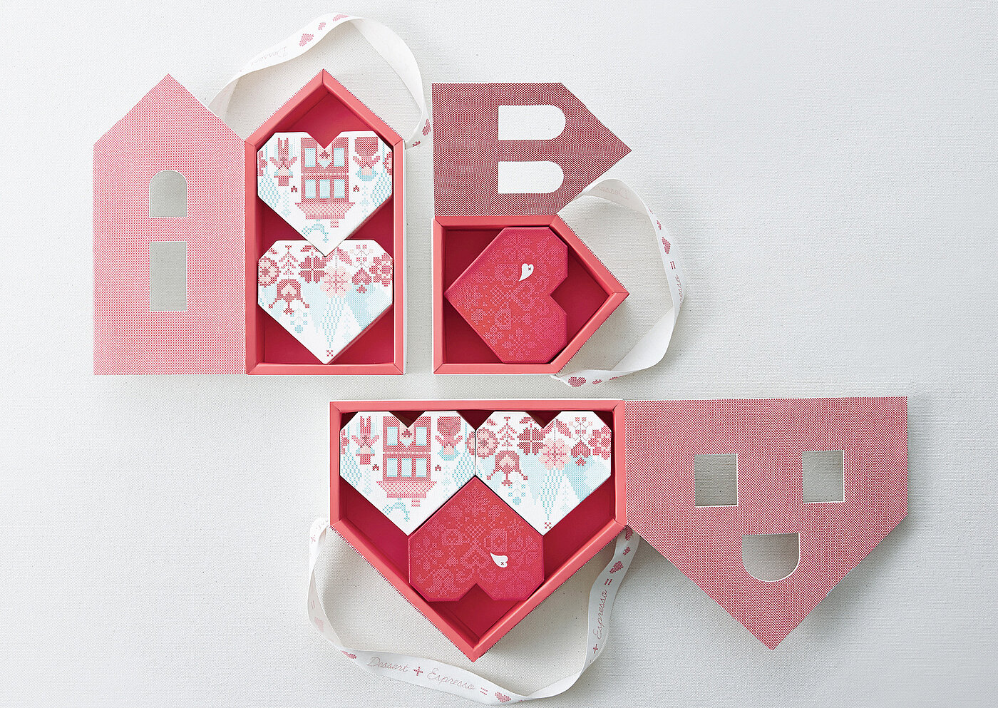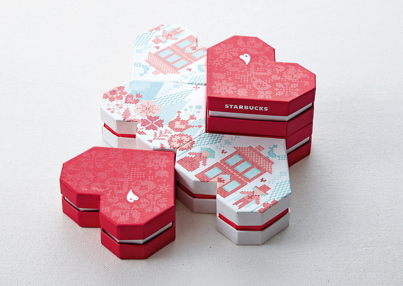 For Valentine’s Day, Starbucks Coffee Korea created chocolate packaging that honours traditional gifting while adding a modern twist: Valentine’s Day Chocolates. Outer boxes shaped like houses encase angular, cross-stitch–inspired heart boxes, with cut-out windows offering a playful preview. Embossed and spot-varnished patterns enhance tactility, and lined up, the boxes form a quaint Belgian village, reflecting the origin of the premium chocolates inside. The design combines symbolism, craftsmanship, and sensory experience, updating the familiar ritual of giving for contemporary audiences and was awarded a Red Dot in 2015.