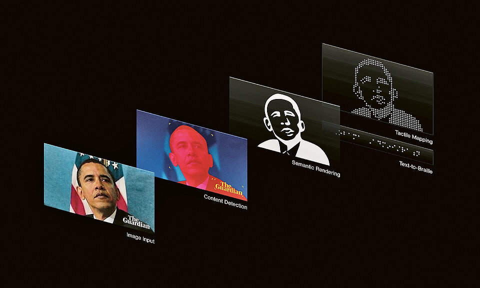 The process starts with the capture or input of a visual image – be it a diagram, a photo or even illustrated text. The Dot Image Processor uses AI to analyse this image. This includes segmenting various elements in the image, such as shapes, lines, text, patterns, background, foreground, etc. It then extracts the most important features and translates them into a tactile format.