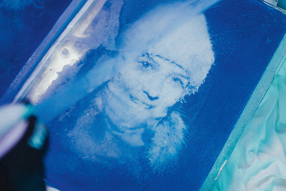 The environmental aspect should play a role in every print and presentation. For the ice book, the loose colour particles of the risography also became an analogy for the transience of snowflakes. By separating the colours, I came up with the idea of printing the front in steel blue in a single colour, and the back in marine red, aqua or sunflower in two colours. In this way, the translation of the hard, extreme moment of freezing succeeded – so only in retrospect, when turning the page, does the whole picture emerge. The trickiest part was certainly the astonishing coating with ice.