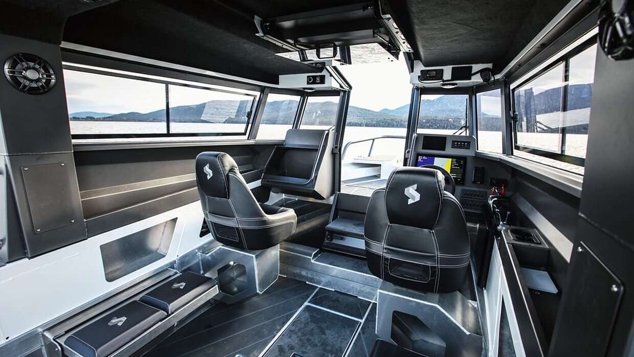The outstanding feature of this aluminium motor boat is its cabin which is constructed of carbon fibre laminate, making it light and stable. The boat offers a lot of room with its two steering seats and two folding seats as well as seating at the sides. An enlarged lower middle section of the windscreen increases the field of vision from the helm. Due to the integration of an anchor winch, the anchor can be operated from the helm.