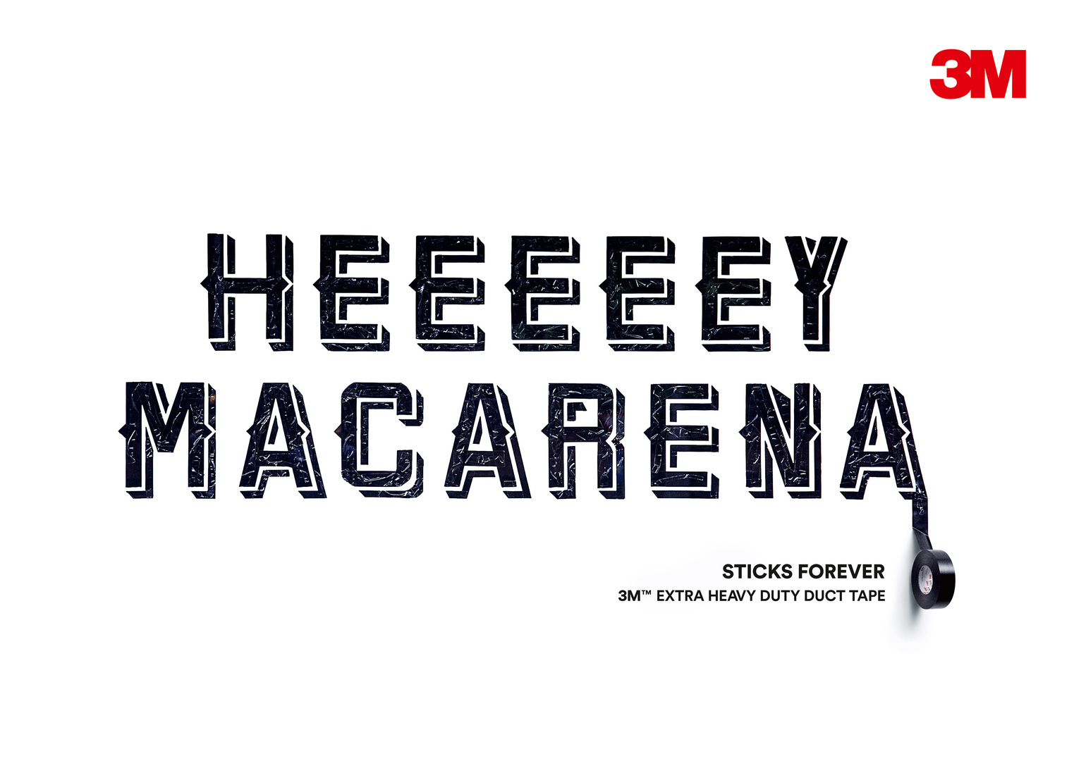 The billboard campaign “Sticks Forever – 3M Extra Heavy Duty Duct Tape” makes use of the proverbial earworm: as soon as people hear the tune of a popular, highly catchy song, they cannot easily get it out of their heads again. In order to demonstrate that this “adhesiveness” also applies to the heavy duty adhesive tape by 3M, three truly catchy tunes were taken and their titles “written” using that tape on numerous billboard sites across Hong Kong. This way, each billboard showed 3M’s adhesive power in a unique, simple and memorable way, in a typeface perfectly matched to the songs. For example, the song line “Heeeeey Macarena” was typified in vivid clear capital letters in line with how it is actually sung, while “Barbie Girl” features a lovely lettering with squiggly serifs. Integrating the product itself into the visual execution offered the opportunity to further strengthen the message of the approach. The billboard artwork was created by Australian tape artist Buff Diss hand-lettering each billboard on-site.