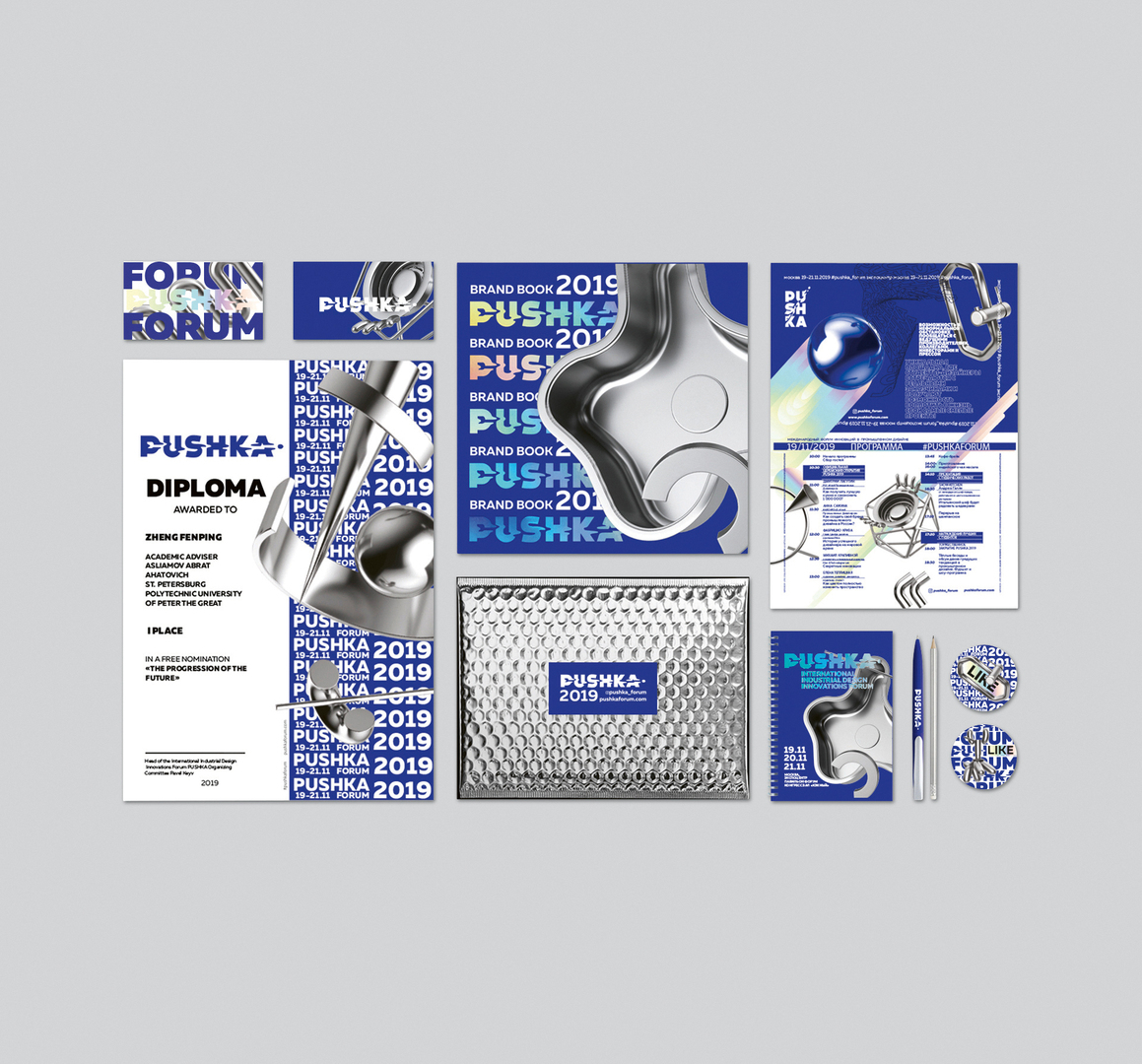 PUSHKA is an international industrial design innovations forum, where design students can establish contacts with manufacturers and get an opportunity to realise their projects. Its brand design is built on the product portfolio of its sponsors and showcases three-dimensional figures of kitchen sinks, taps, hoods and blenders, turning everyday kitchen items into art objects. Furthermore, modern dynamic font compositions represent the creative approach of the students. Thus, the brand design’s visual elements are characterised by a wide variety of shapes, allowing it to be flexibly applied on posters and other media.