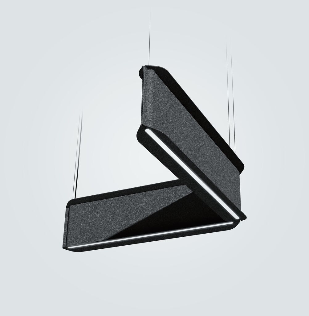 Absorb I is distinguished by its acoustic panels with a flanged design. Available in different lengths, these pendant lights can be connected in line or with 90-degree, 120-degree or custom-made corners. Absorb I can thus be used to create individual configurations and seamless closed patterns. The sculpted acoustic PET felt panels are available in 30 colours and offer effective sound dampening, thanks to a layer of acoustic protection embedded between the exterior felt panels.