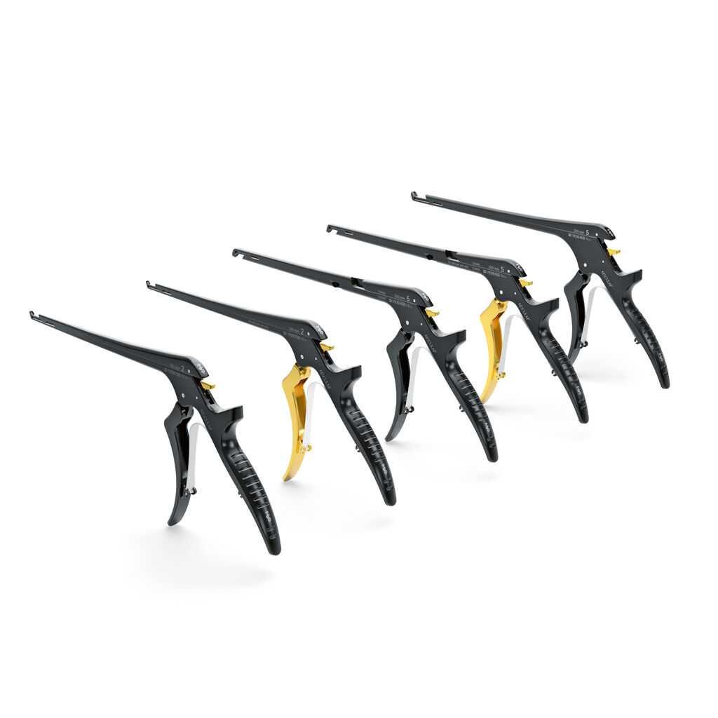 The Aesculap SQ.line KERRISON Bone Punches were developed for spinal and cranial neurosurgery and enable ergonomic backhand and forehand punching. An optimised shape, weight distribution and handle geometry reduce the force required and support ergonomic working conditions. Haptic and acoustic feedback improve control. The mechanism enables quick unlocking with a lever, allowing for intraoperative cleaning and machine reprocessing without pre-cleaning. The Noir plus coating increases durability and reduces light reflections.