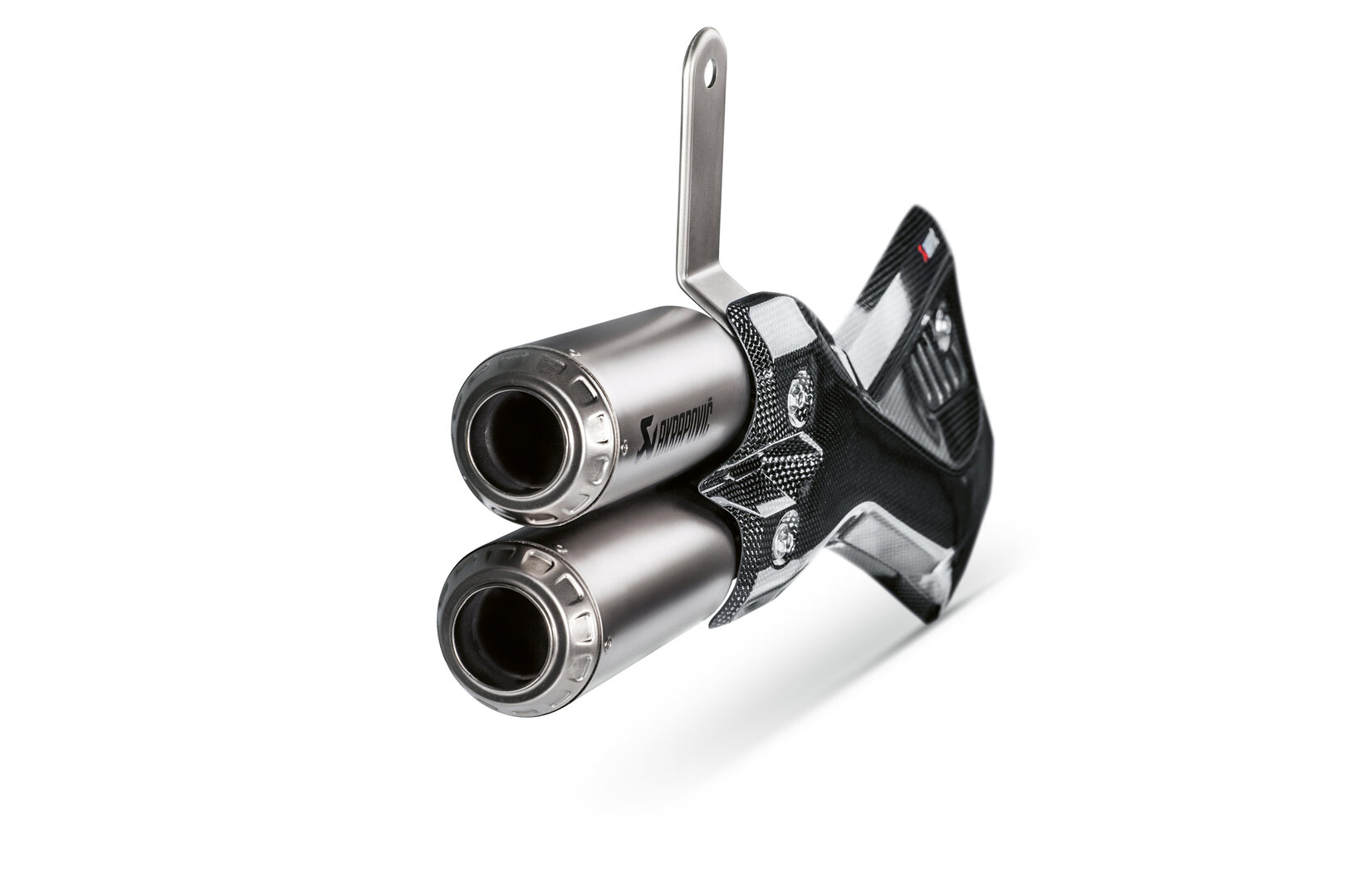 The particular form of the Akrapovič Slip-On Line (Titanium) for the Ducati Multistrada 1200 Enduro and Multistrada 950 is characterised by two symmetrical mufflers representing a two-cylinder engine. The use of titanium alloys has reduced the weight by 43 per cent for enhanced handling. The innovative design of the collector ensures an equal flow of exhaust gasses for a deep sound. Details like the handcrafted carbon-fibre heat shield, the laser-engraved logo, the perfect welds, and the sandblasted finish are indicators of precision engineering.