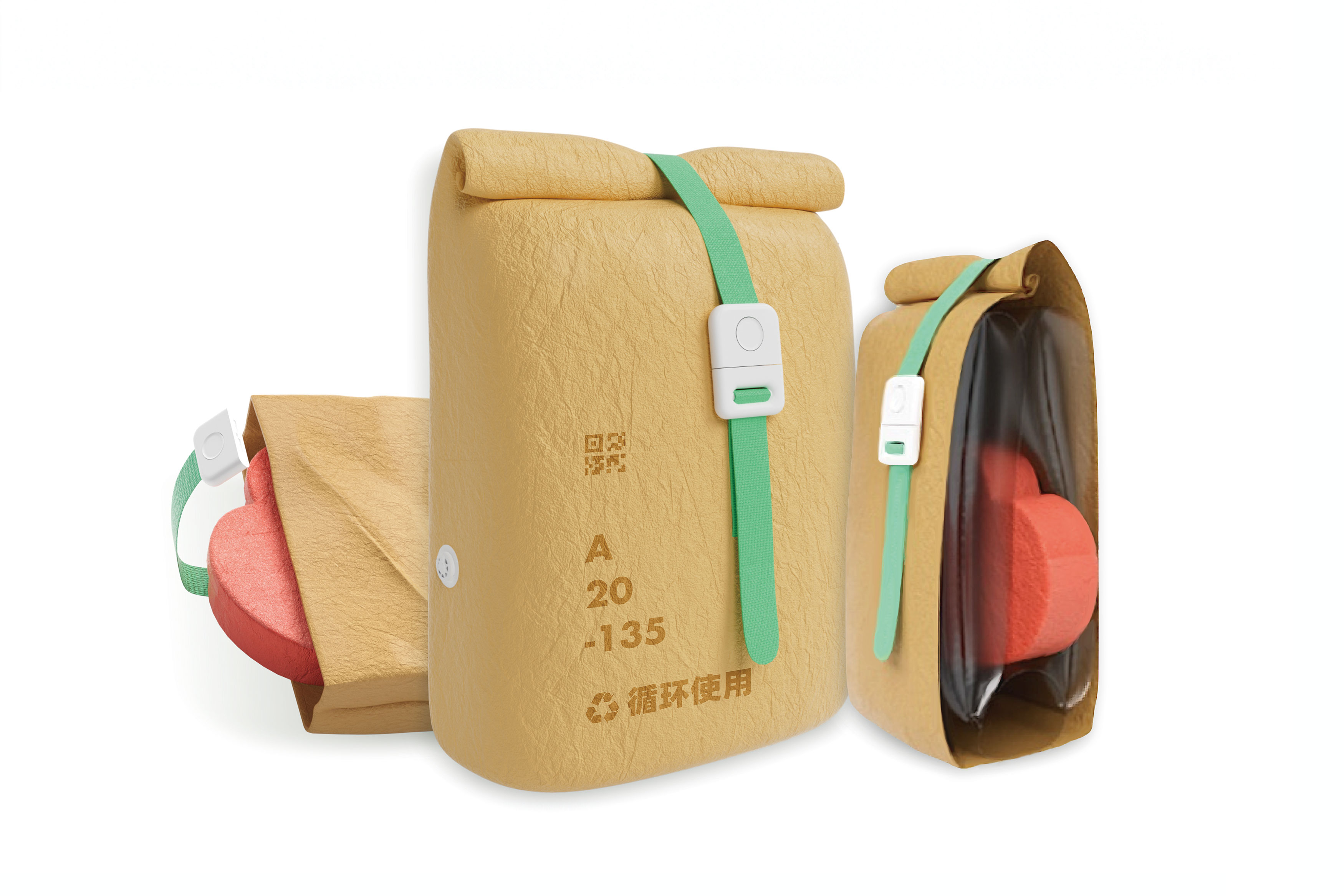 AntSure tackles key challenges with recyclable packaging made of a waterproof outer layer and an inner layer of PHA, a new microbe material. This packaging can be inflated for shockproof protection, secured with a buckle and express seal instead of tape, and includes an ID code binding to waybill information for data protection.