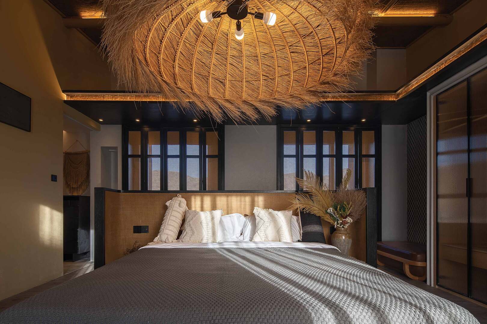 In the open dining area, comfortable and spacious sofas are combined with cabinets and a bar counter. The master bedroom has a leisure area in the entrance porch, and the south- facing bed has a view of the outdoor landscape. The original building’s oblique roof design is retained, and a large bird’s nest chandelier emphasises the comfortable and relaxing wabi-sabi holiday aesthetics .