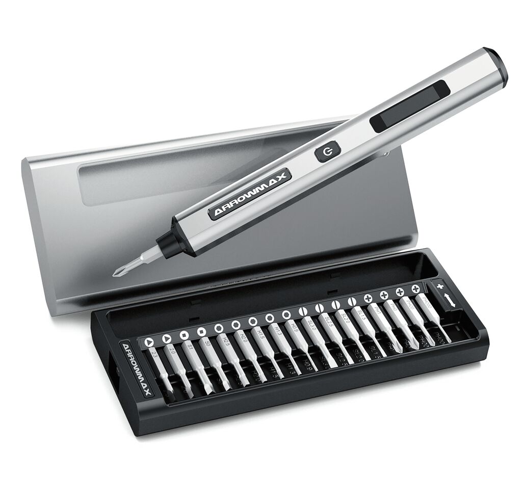 The Arrowmax SES PRO is an electric screwdriver with smart motion control. It is equipped with a powerful lithium-ion battery, a 32 bit microprocessor and a three-axis gyroscope. The unit is controlled via a single button and a seamlessly integrated OLED display, which can be used to preset the torsional force and speed in steps. Most 3D products, computers, four-axis unmanned machines, glasses, watches, toys, models, etc. can be installed and removed with the screwdriver.