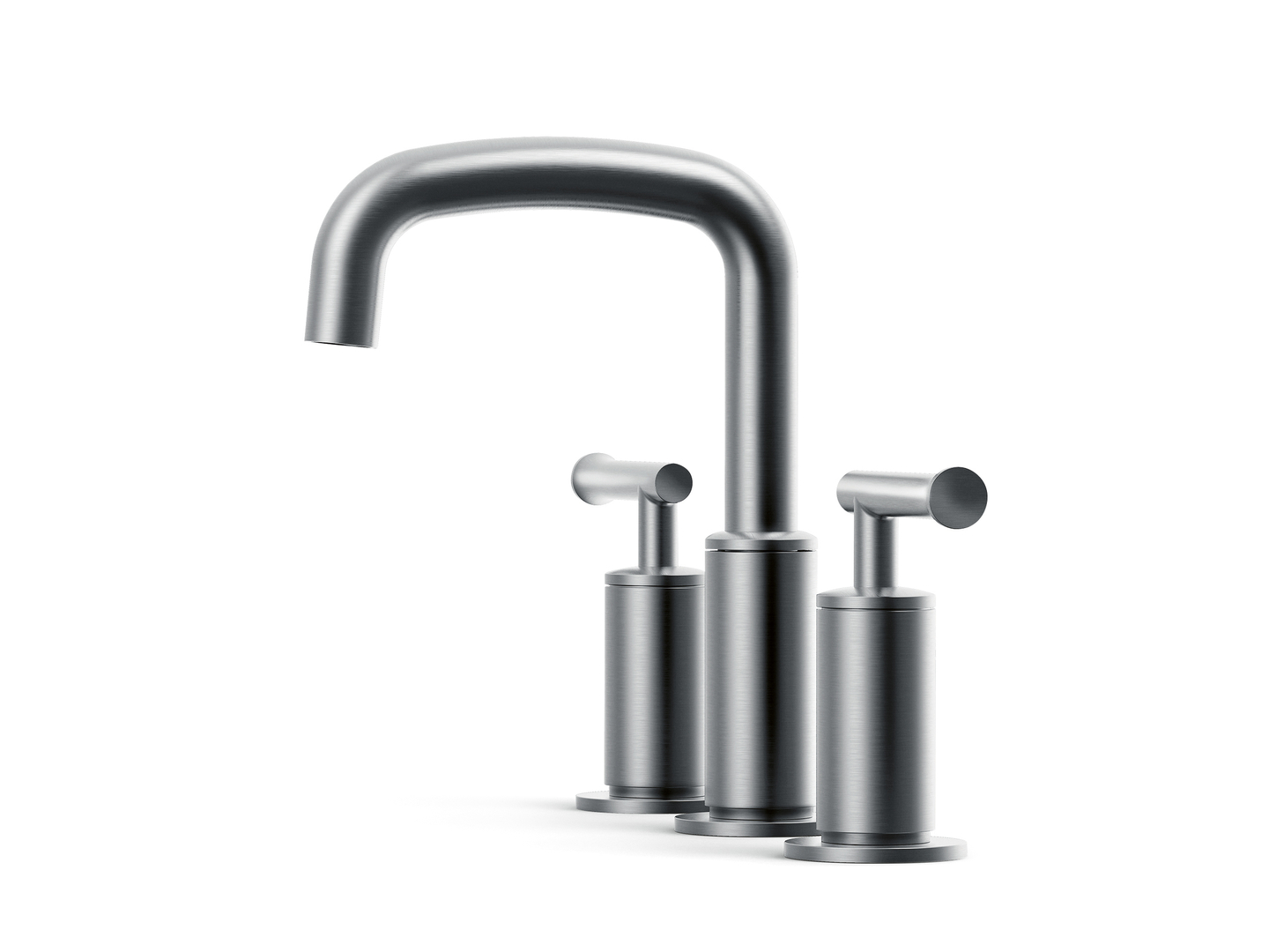 Artificer skilfully combines modern and classic aesthetics. The complete absence of sharp edges and flat surfaces defines the appearance of the three-piece basin mixer. The 180-degree curved spout forms the striking centrepiece of this ensemble. Its cylindrical body is flanked by two regulators with identical shaping, ensuring a clear appearance. The right-angled levers running parallel to the edge of the basin add an interesting geometric accent to the gentle contouring.