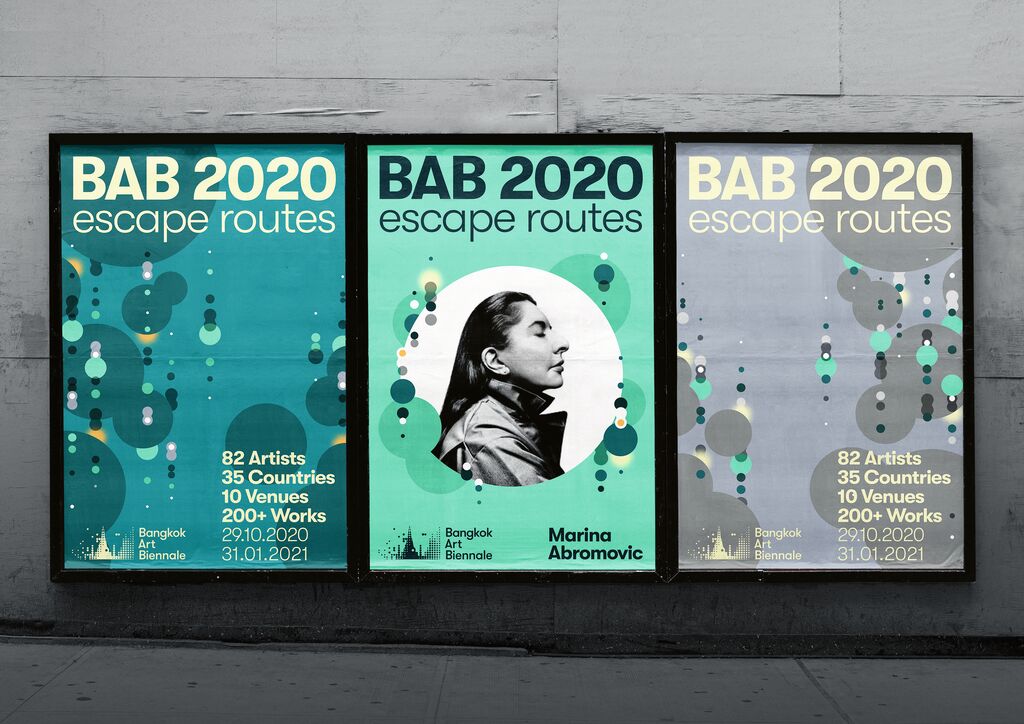 The brand design of the Bangkok Art Biennale (BAB) is built upon the form of a circle to reflect the brand’s core values of empathy, inclusivity and community through art. This concept extends throughout the design, providing a consistent brand narrative. The logomark is created from a display of circular dots, each representing key stakeholders in the art ecosystem such as artists, audience and supporters. The circular key visual pattern depicts the essence of BAB2020’s theme “Escape Routes”. It is designed to be easily scaled, repeated and adapted to fit both physical and digital applications of all sizes.