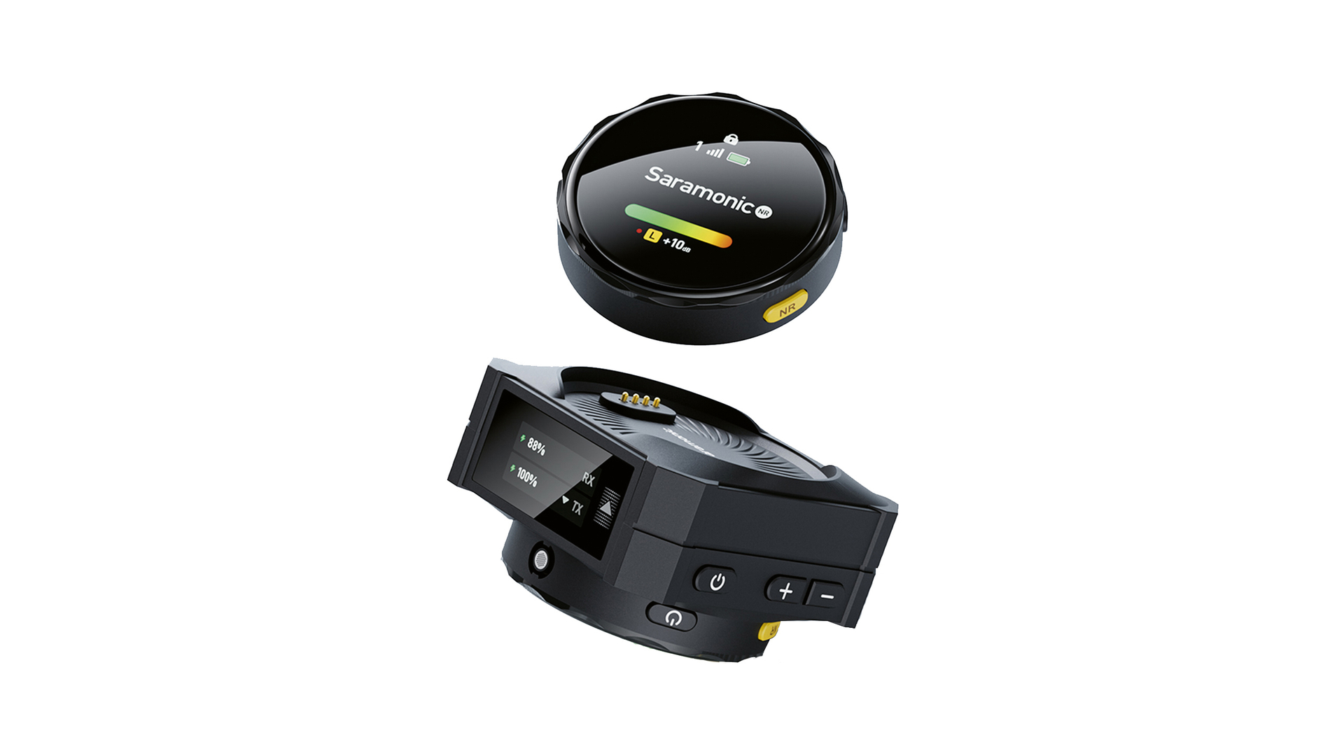 The BlinkMe is a cordless microphone receiver. For charging and transport, the two transmitters are magnetically attached to the front and back of the receiver, which can also be used independently for audio reception. The transmitters feature a round touch screen for easy operation. Thanks to its standalone operating system, Blink ME displays a wide range of content when connected to smart mobile devices, including personalised content such as logos or digital business cards.
