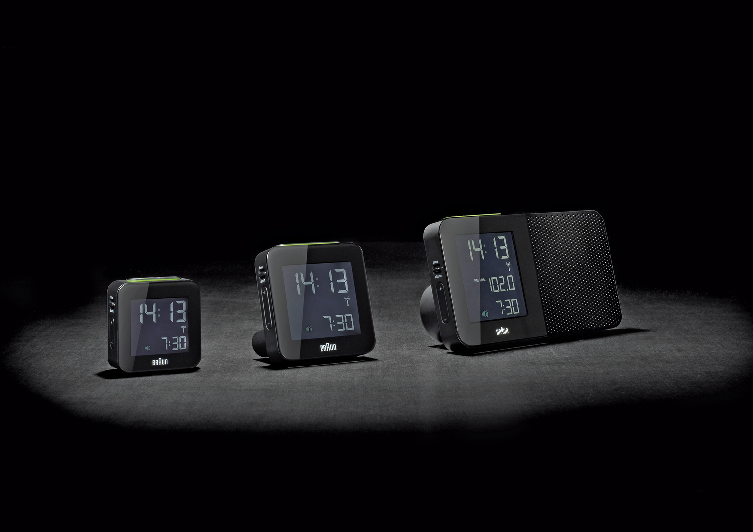 The new digital clock series from Braun is characterised by resolutely geometrical forms. The formally distinctive battery compartment on the reverse side serves as a standing base and is clearly distinguished from the flat surfaces of the display housing, which is slightly slanted back for enhanced readability. The time and alarm display are arranged in a graphically clear manner. Functional elements for setting time and activating the alarm are integrated into the lateral surfaces in a user-friendly way.