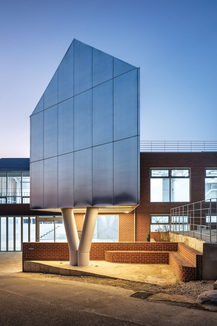 Buan Art Factory is situated on the grounds of the former Buan Salt Factory, a traditional refined salt factory located in the old city centre near a local permanent market. The market was vital to the development of Buan’s fishing industry, but it has fallen into disrepair since its operation halted in 2009. The salt factory occupies an atypical, deep lot with a narrow entrance. As an urban regeneration facility, the building’s long metal facade serves as a prominent landmark local residents travelling to and from the market. The architecture of Buan Art Factory pays homage to the rich place history by creating open spaces that interact with the existing surroundings. The receded brick mass on the first floor intersects the protruding steel gable mass above to form an overhang, carving out a welcoming space for passers-by. By gradually increasing the building height, the building mass feels less oppressive from the outside. The first floor is seamlessly connected to an old residential area, and a road is built as an extended alleyway for the house behind the site. From here, one can see past the market entrance and into the open space behind it. The second-floor terrace also disperses the building’s activities into the alleyway, allowing for communication with passers-by. On the exterior, the gable roof and use of highly reflective metal are inspired by the salt factory. Exposed steel structures allow natural light to flood the enclosed space through the windows of the gable mass. Under the asymmetric roof, every room is well-lit and arranged in a regular manner to facilitate modular art spaces. Inside, the ceiling with exposed silver deck plate is reminiscent of a salt cauldron that reflects light, and it works together with the transparent polycarbonate dividing the first floor to disperse natural light in the space. Red Dot Award: Design Concept | Ready to Launch | Architecture