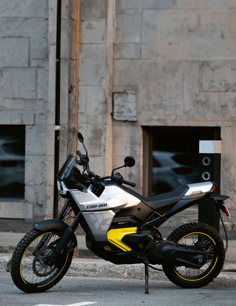 The Can-Am Origin is an all-terrain electric motorcycle that combines urban mobility and off-road capabilities in a reduced, powerfully modelled design. Compact proportions around the centrally placed battery are supportive of weight distribution, while the enclosed chain case reduces noise. Inspired by the silent flight of the snowy owl, the design emphasises aerodynamic efficiency and close interaction between driver and machine. The modular platform is designed for durability, easy maintenance and recyclability.