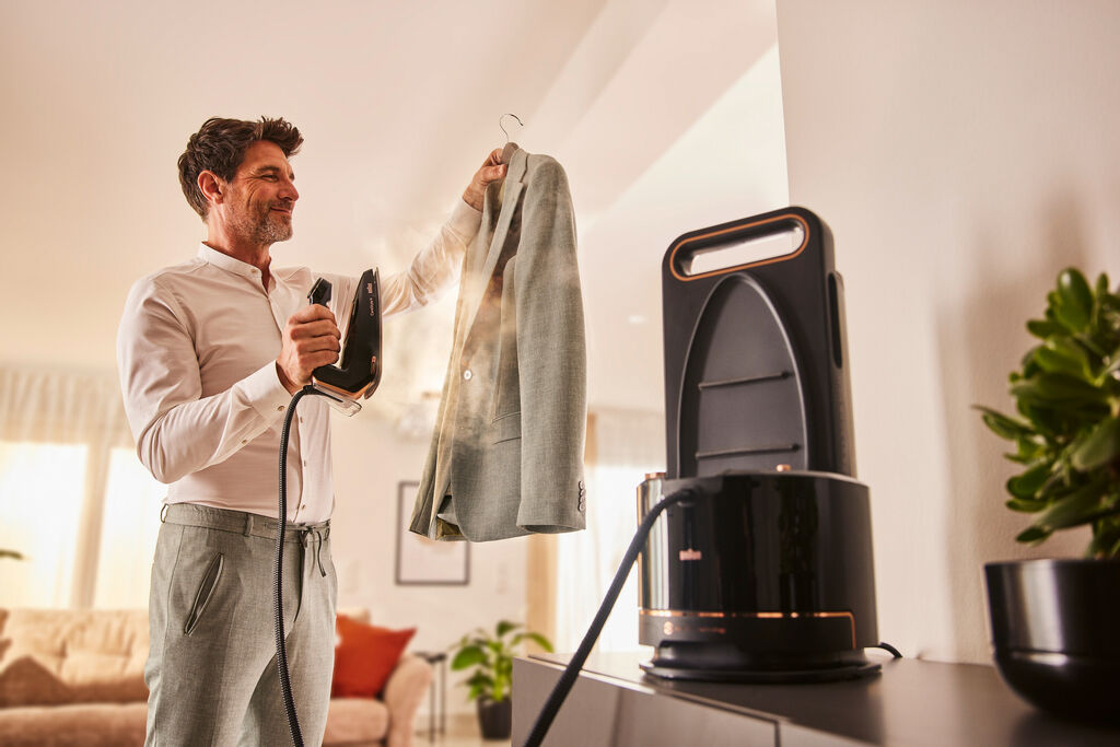 Equipped with AutoClean and Auto Steam technology, the CareStyle 9 steam generator iron makes it easier to smooth clothing effectively and gently. The appliance detects when descaling is needed and performs this task in just a few minutes. The required amount of steam is released automatically during ironing. The elegant black ironing station has a cylindrical shape with bronze-coloured highlights. With its compact design and practical carrying recess, the iron can be parked vertically.