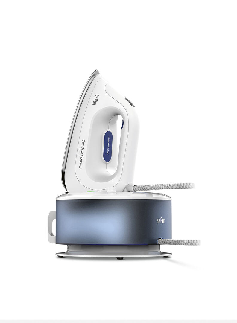 The new CareStyle Compact bridges the gap between traditional irons and professional steam ironing systems, merging the advantages of both into one compact product solution. The water tank is located in the base, which makes the iron easier to maneuver. Thanks to a locking system, it is possible to carry the station easily and safely by the ergonomically sophisticated handle of the iron. All functions are self-explanatory and intuitive to use.