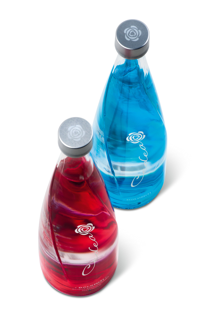 The packaging design for the Cedea Luxury mineral water is inspired by the Ladin Dolomites and the legends and myths revolving around the natural light phenomenon Enrosadira. Caused by the special mineral dolomite, the mountains light up in a reddish, burning hue at sunrise and sunset, lending the scenery a magic ambience. By “resembling the legendary magic Garden of Roses”, the packaging of Cedea wants to capture this very moment. The result is a glass bottle that makes the water glare and flare to surprising effect. The colours of the bottle are meant to resemble the special glow of the Dolomites bathed in the mineral’s rose red and the blue of the sky.