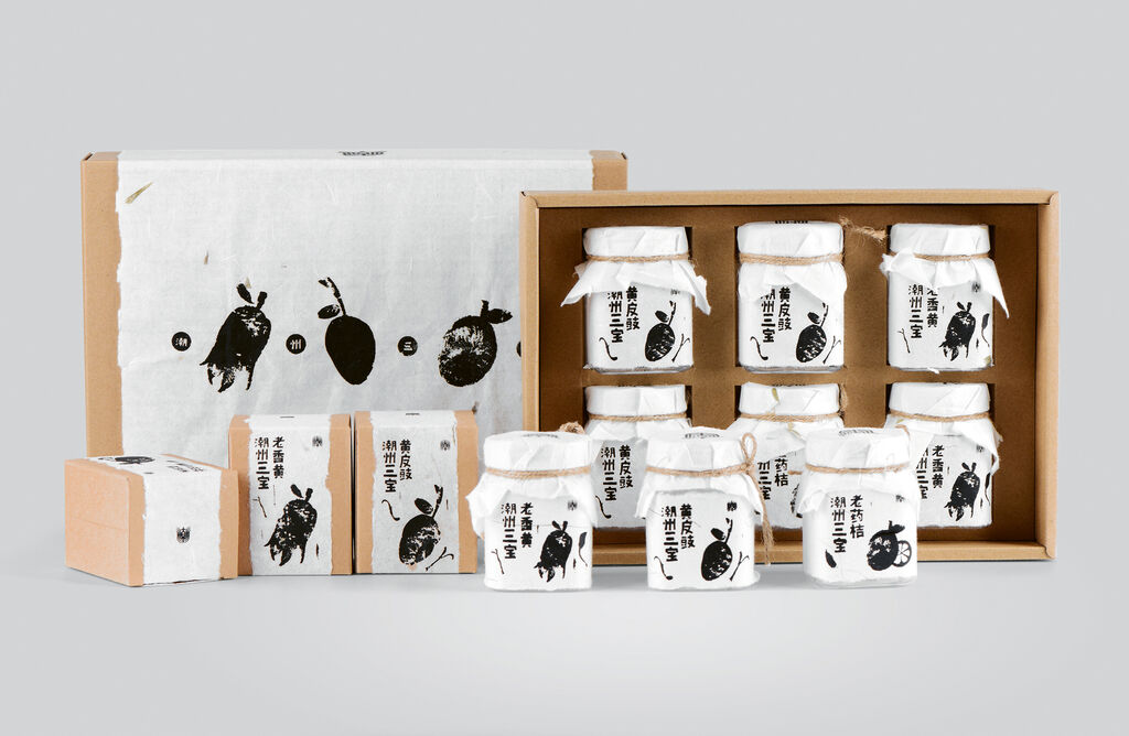 Chaozhou Sanbao is a group of three products from the Chaozhou region which are extracted from plants in that area, for example kumquat. These plants are known to have beneficial and protective effects on the human organism. Inspired by local crafts, the packaging evokes natural simplicity. The illustrations which portray the respective main ingredient and the typography are created using manual woodcut engraving. Both the illustrations and the typography are then applied to handmade paper applying manual screen printing. The paper is used for the labels as well as for the cover of the outer packaging.