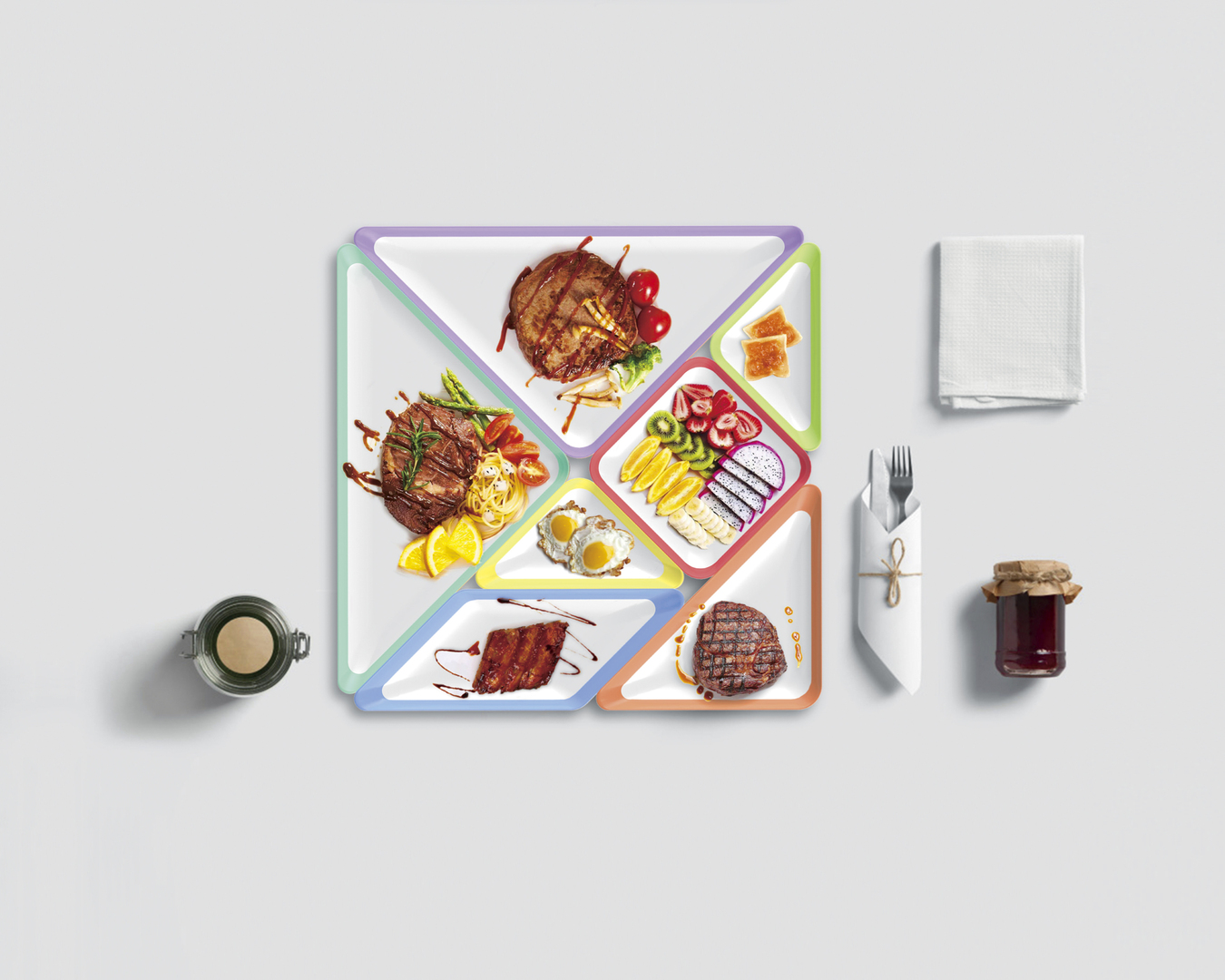 This is a creativity plate design for children. Seven plates in an array of colours, shapes and sizes can be combined to form various shapes. The ideas you can build with this creative dining table set are limitless. This way of abstract modelling stimulates creativity and imagination, increases children's interests towards mealtime, and promotes interaction between children and parents at the dining table.