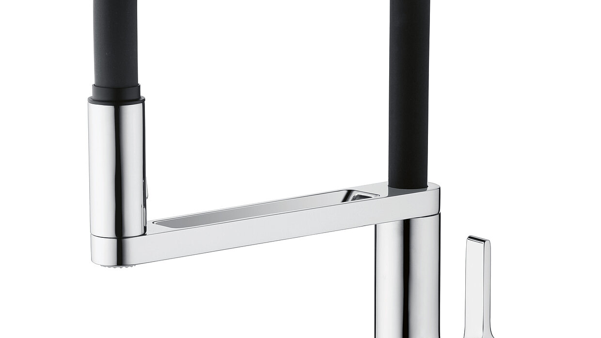 Simple geometrical forms were the source of inspiration for the design of the Chopin basin mixer. Shaped by square and rectangular elements, its foot and wall plates form the thin base for the curved water outlet. A circular controller embedded in the plate encompasses the tap and regulates the water temperature. The basin mixer easily switches on at the touch of a button.
