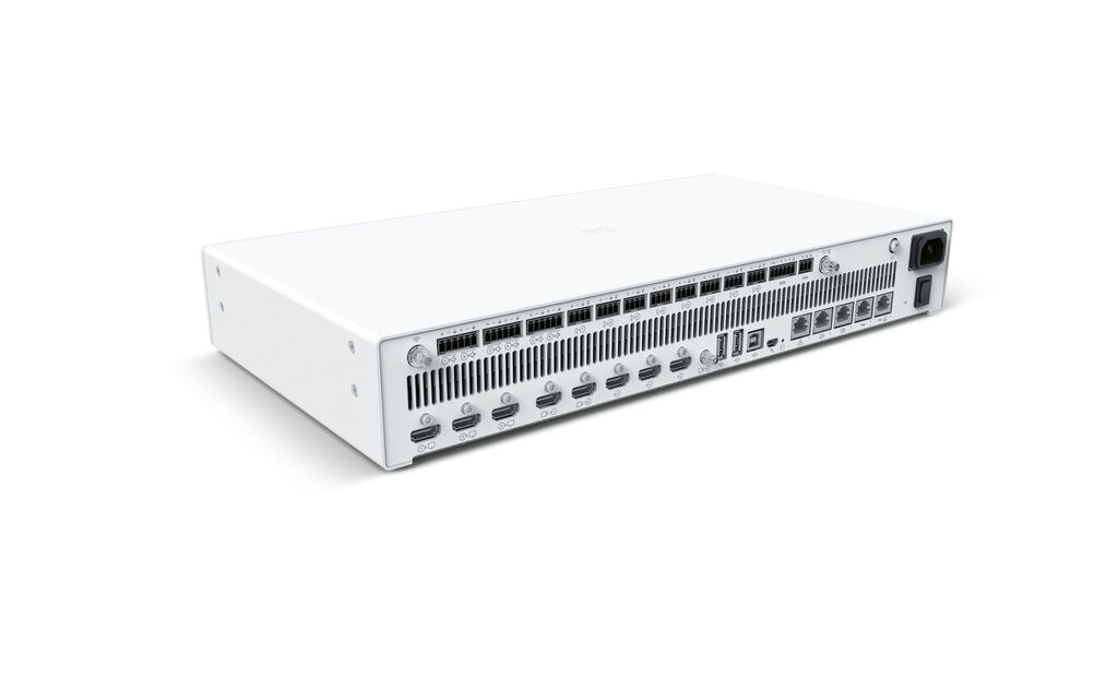 The Cisco Webex Codec Pro is equipped with a high-performance 4K video engine. It is an intelligent hub for integrating cameras, microphones, speakers and display configurations into one complete conference system. A softly shaped air inlet is located at the front together with a system power LED that is discreetly visible when the device is powered up. The main body consists of sturdy metal. Connectors at the back are clearly organised and enable intuitive access.
