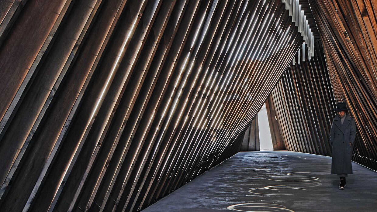 Appearing to float above a tea field, this teahouse becomes part of a new landscape system by 'vanishing' twice. The first 'vanishing' involves 170 steel poles scattered across the field, creating a forest-like installation that conceals the teahouse. The second has misting devices fitted to 100 poles, generating an enigmatic drifting fog that envelops the teahouse, inviting a contemplative experience.