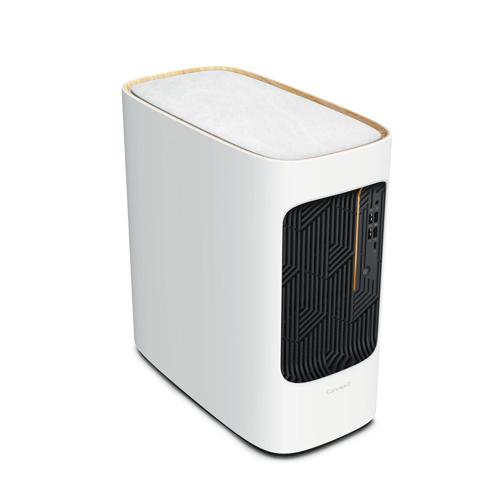 ConceptD 500 is a powerful and aesthetically pleasing desktop with a Nordic design language and user-friendly details. Thanks to its low noise emissions and comparatively small size, the desktop can be integrated into any work environment while taking up only little space. With its timeless design and the nature-inspired marble and wood pattern, as well as the amber-coloured control light, it also blends into different interiors, for example in an office or living room.