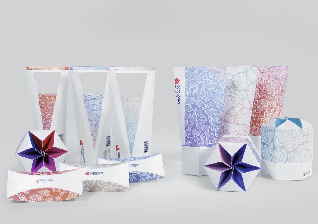 The coral care brand stands for physical sun protection products. UV clothing, caps and parasols are offered because corals have proved to be harmed by the use of chemical sunscreens. As a nod to the everlasting cycle of nature, the logo bears a certain resemblance to the infinity symbol. The packages create an element of surprise by appearing like cosmetics but actually containing textiles. Vibrant colours, inspired by healthy coral reefs, emphasise the brand value of vitality. In contrast, pale drawings on a coloured background also point to the threat of coral bleaching.