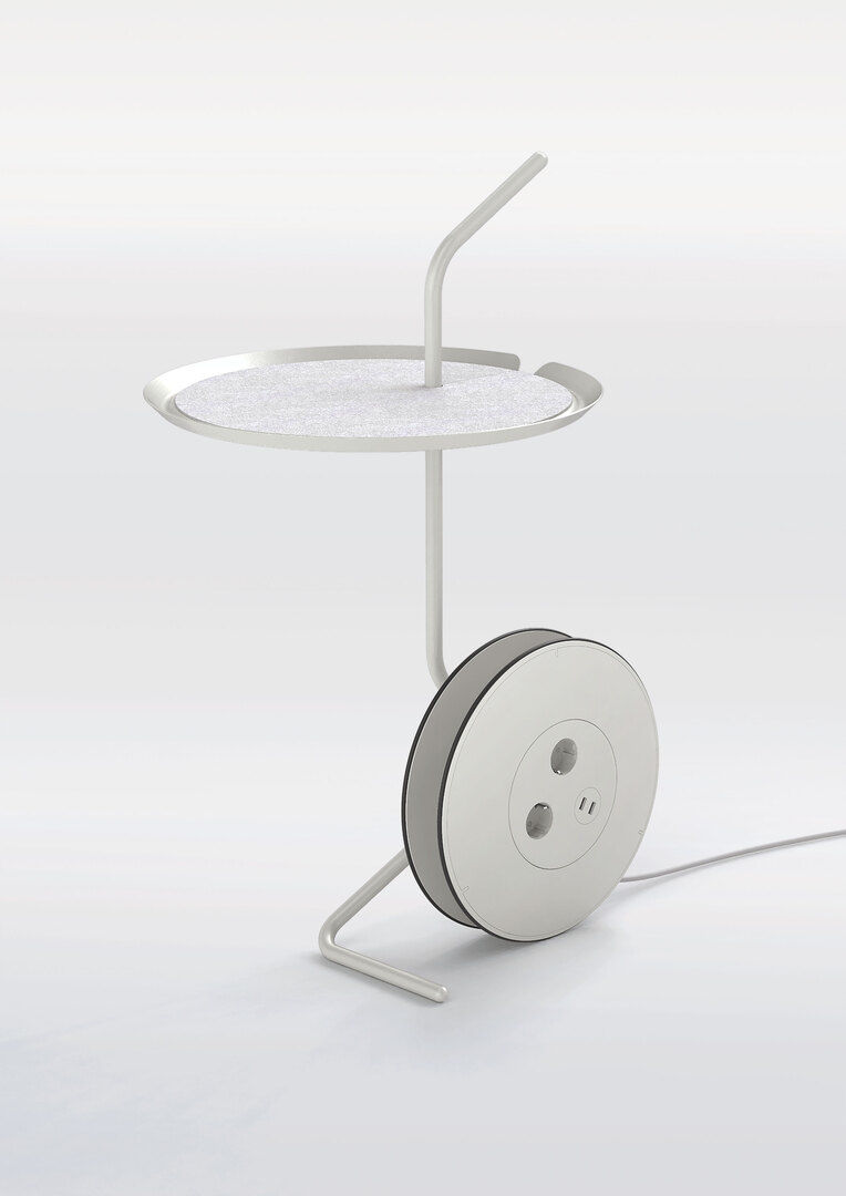 Code Reel Table redefines the relationship between furniture and multi-socket strips and turns the hiding and containment of the strip into a feature. The wheel houses 2 sockets (220v) and 5 USB ports, as well as an extension cable that winds up automatically with the push of a button.