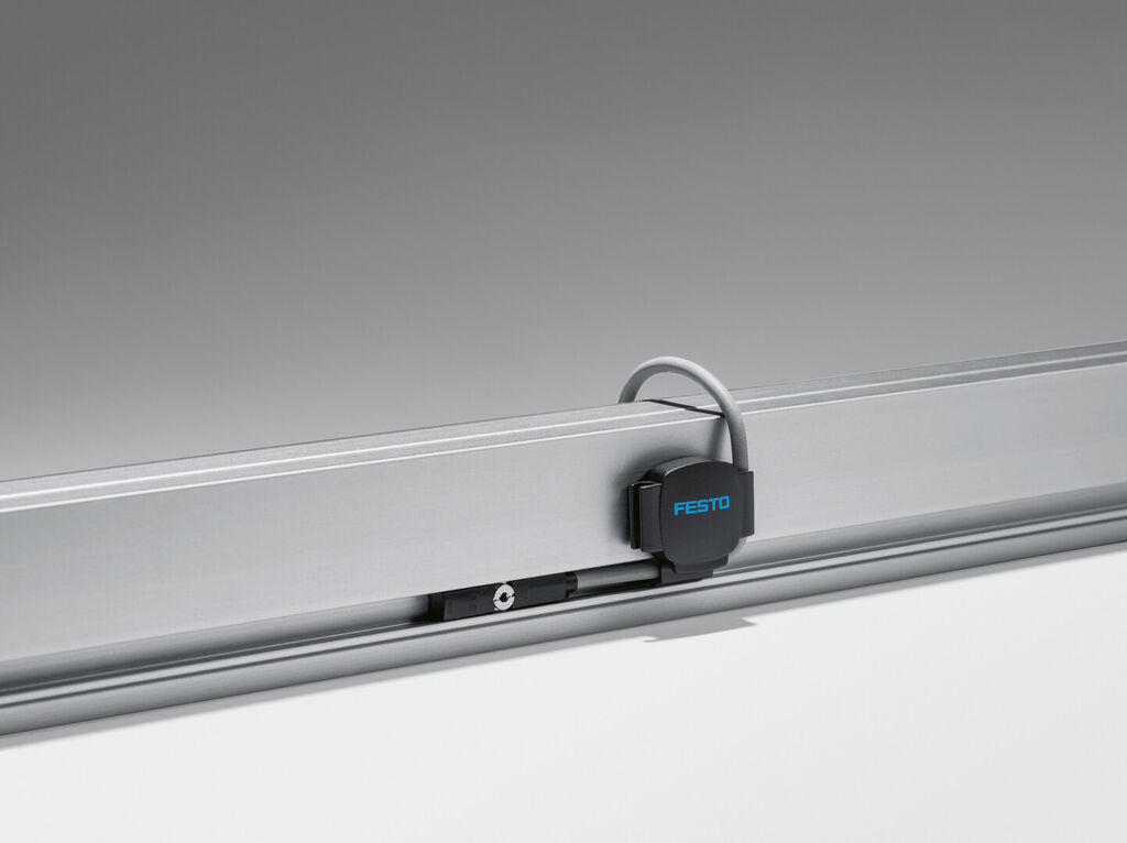 The cable clip DADG is used to secure sensor cables in T-slots. A sensor is placed in a slot and with the help of the clip, which is also secured in a slot, it becomes possible to guide the cable of an installed sensor in the desired direction. The user can either secure a cable so that it runs in the direction of the slot or, alternatively, produce a 90-degree bend – for one or even two sensors. The cable clip can be fitted without tools and without a need for force. A slight clicking noise confirms that a clip has been correctly secured in a slot.