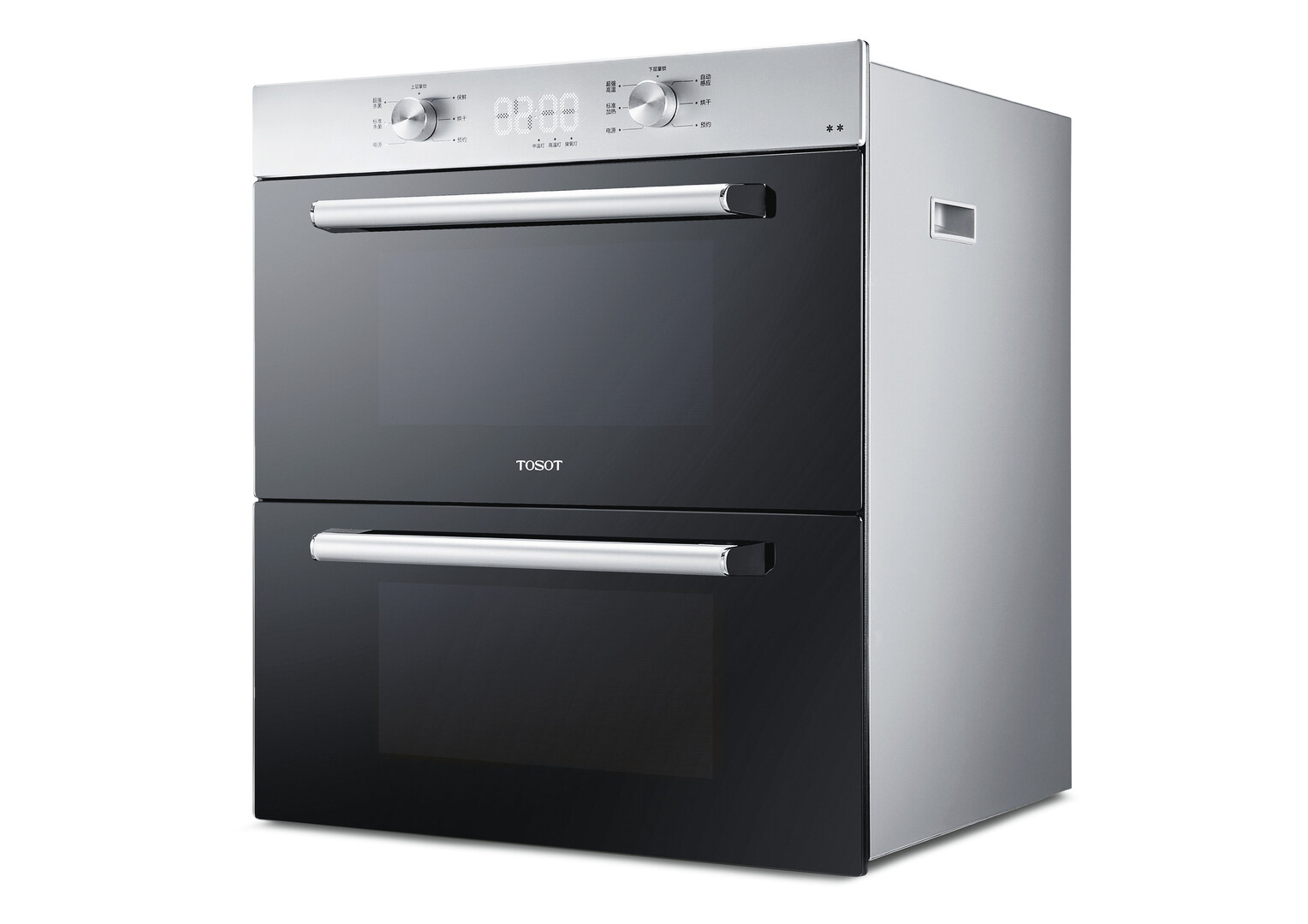 The Disinfection Cabinet is a steriliser with two drawers, one above the other. Its reservedly designed, elegant front is characterised by frameless surfaces of black, tempered glass. Two slim, cylindrical handles of brushed aluminium provide accents, are pleasant to hold and durable. There is a large LED display integrated in the operating panel that presents information in a clear and lucid way. Two round control knobs add a haptic element to the user interface, while windows facilitate a direct view of the interior.