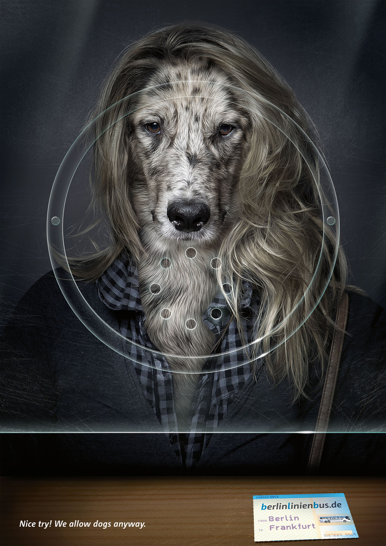 The advertising campaign “Dogs on a bus” promotes the unique advantage of the client berlinlinienbus.de over their competitors: it is the only long-distance coach operator that allows dogs on board. In order to visualise this, the print campaign shows dogs in front of a counter trying to buy a bus ticket. On the assumption that the dogs would not be allowed on the bus, they have been dressed up like humans by their owners. Thus, a humorous look was created that positions berlinlinienbus.de as a fun and friendly way to travel.