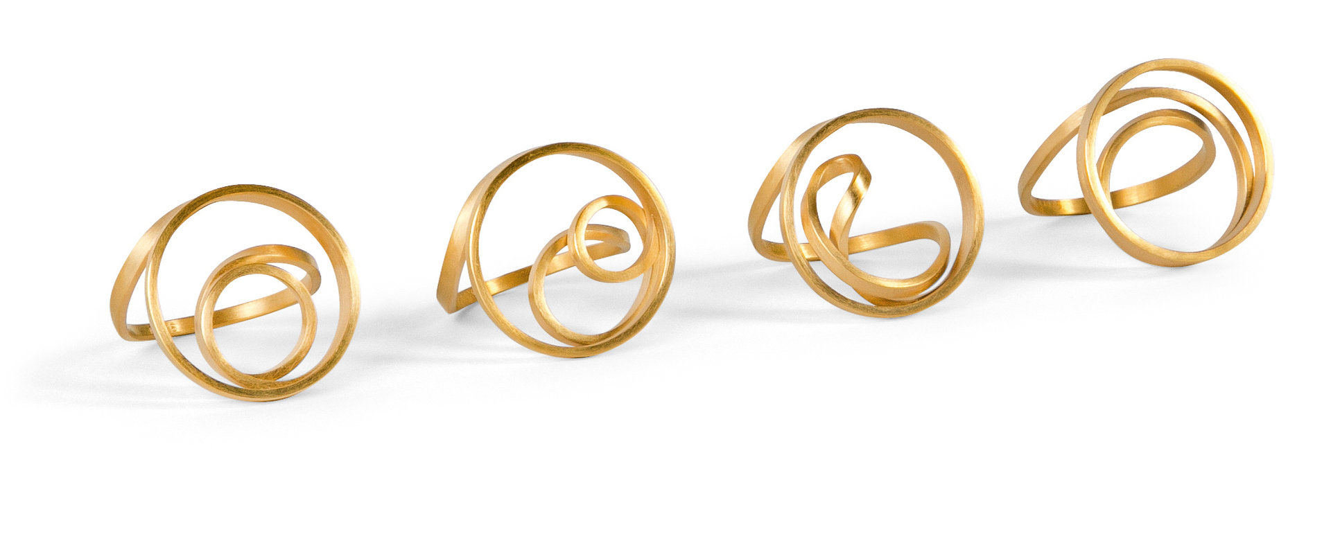 The smaller bands of this finger ring can be twisted out of the frame and, in doing so, move into the centre of the circle. This creates a ring band which rapidly wraps itself around the finger and eventually runs back into the frame. Ring band and ring head thus achieve a fluid transition to the frame in all available versions. These pieces of jewellery come in yellow gold, white gold, silver gold-plated or silver.