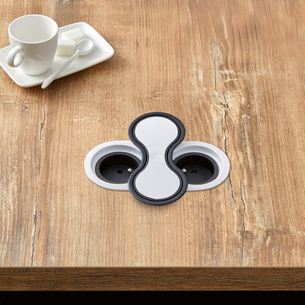 Eight IP44 is the waterproof evolution of the Eight socket and retains its characteristic eight-shaped silhouette. It is easy to operate: a simple press in the centre is all it takes to open the socket. The silicone seal provides additional safety and protects against liquids, for example on work surfaces or in the dining area. The compact depth of less than 46 mm enables installation above drawers, while the special fixing system allows integration into 5 to 40 mm thick panel materials.