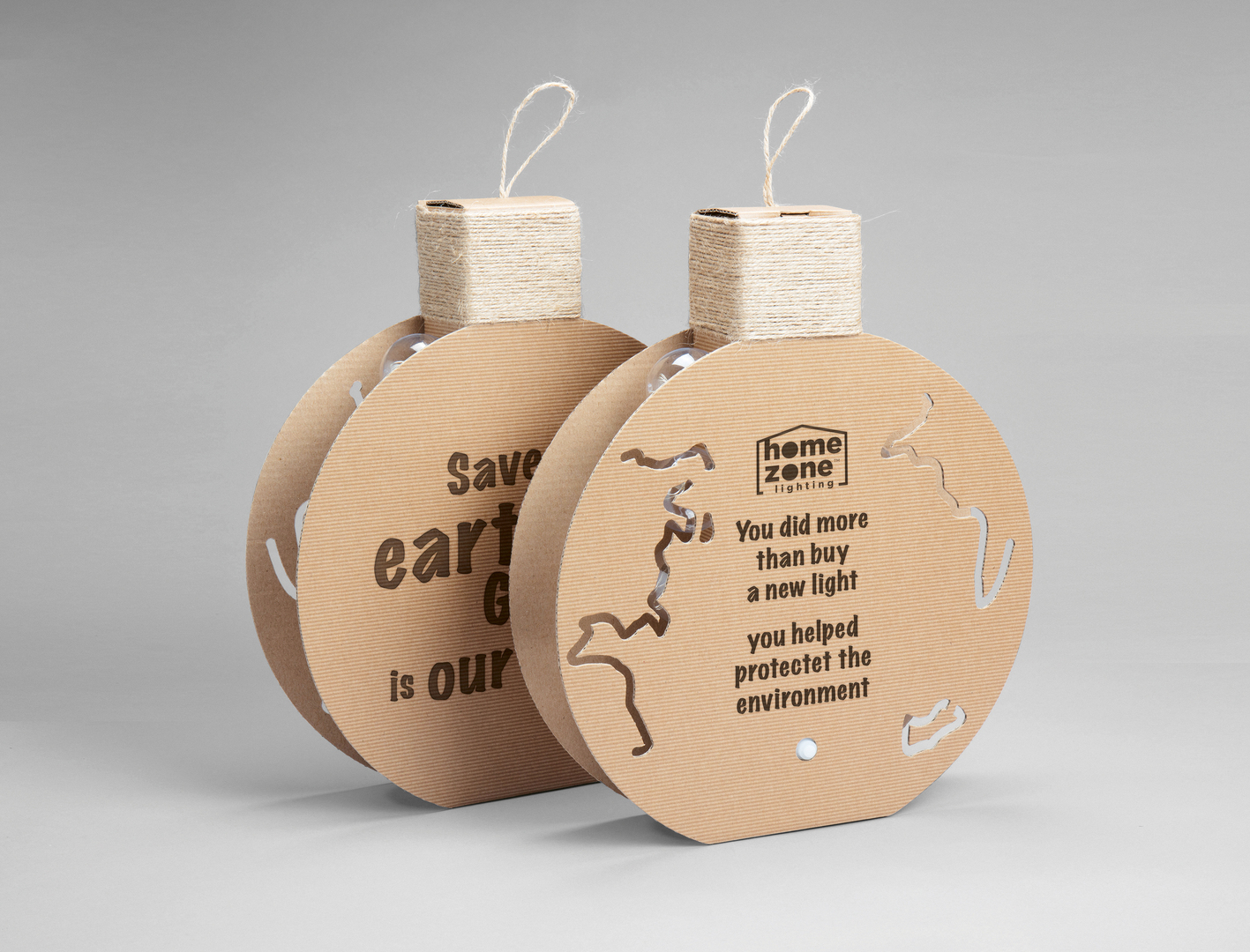 To enhance a set of solar light bulbs, this packaging implements the idea of sustainability. The rustic package is composed of corrugated cardboard, with soybean ink printing only. No glue is used to affix the ten bulbs included. Shaped like a bulb itself, the package clearly references the product, while an integrated switch serves as a special incentive for consumers. Once the light is switched on, it shimmers auspiciously through the punched-out shapes. The hemp rope used to close the pack corresponds to the decoration on the bulbs.