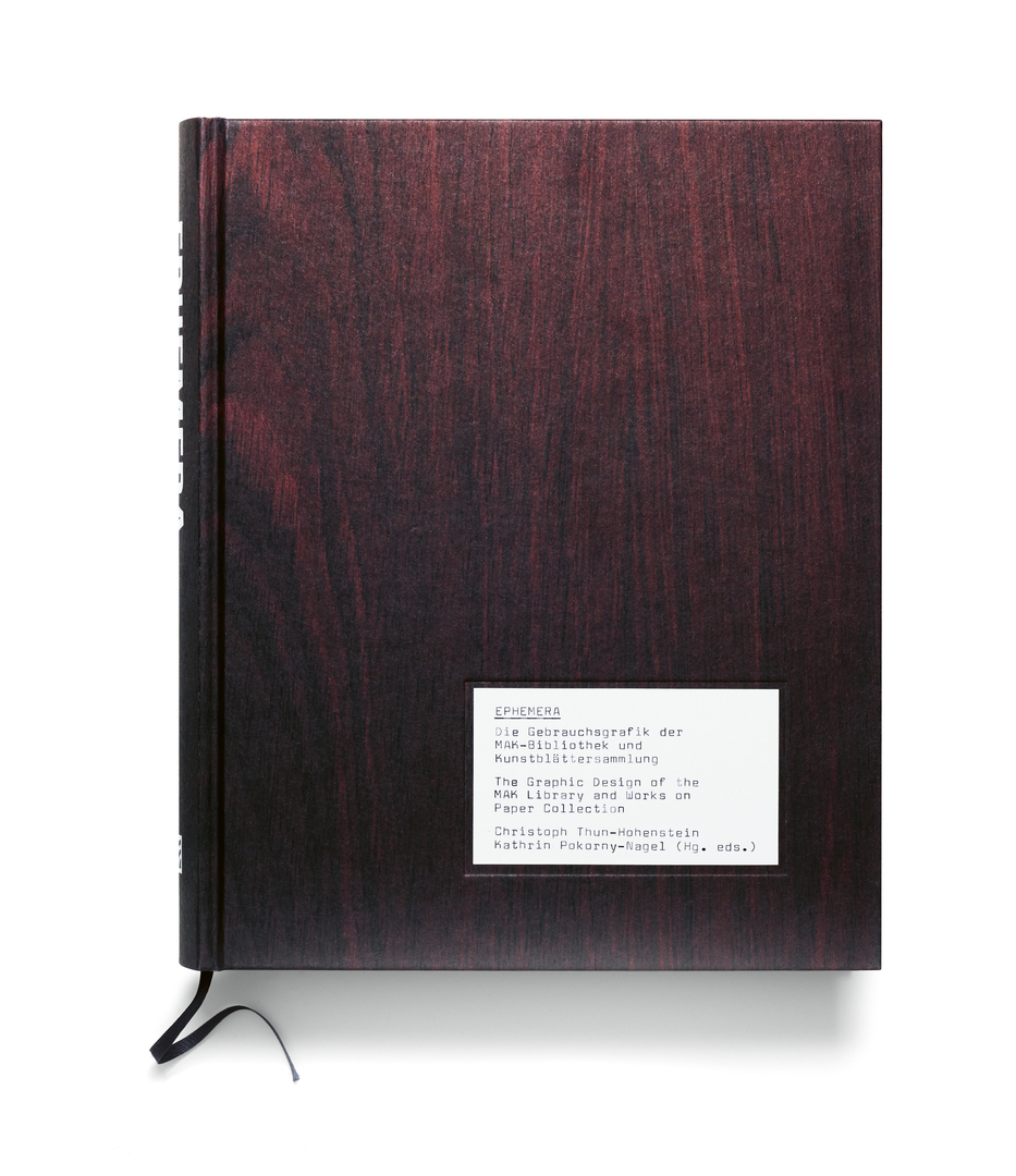 The book “Ephemera” is divided into eight chapters and shows examples of the graphic design of the library of the Austrian Museum of Applied Arts and a collection of works on paper from the 18th century to the present day. Every chapter begins with a photograph of the area of the museum which is not open to the public, rooms where exhibits are stored and researched, arranged in various forms, from collection files and boxes to individual sheets. Even the cover design, with its wooden structure and archive label, resembles an archive box. The design initially seems very reserved, but with the red edge colouring on three sides, it alludes to the rare works within.