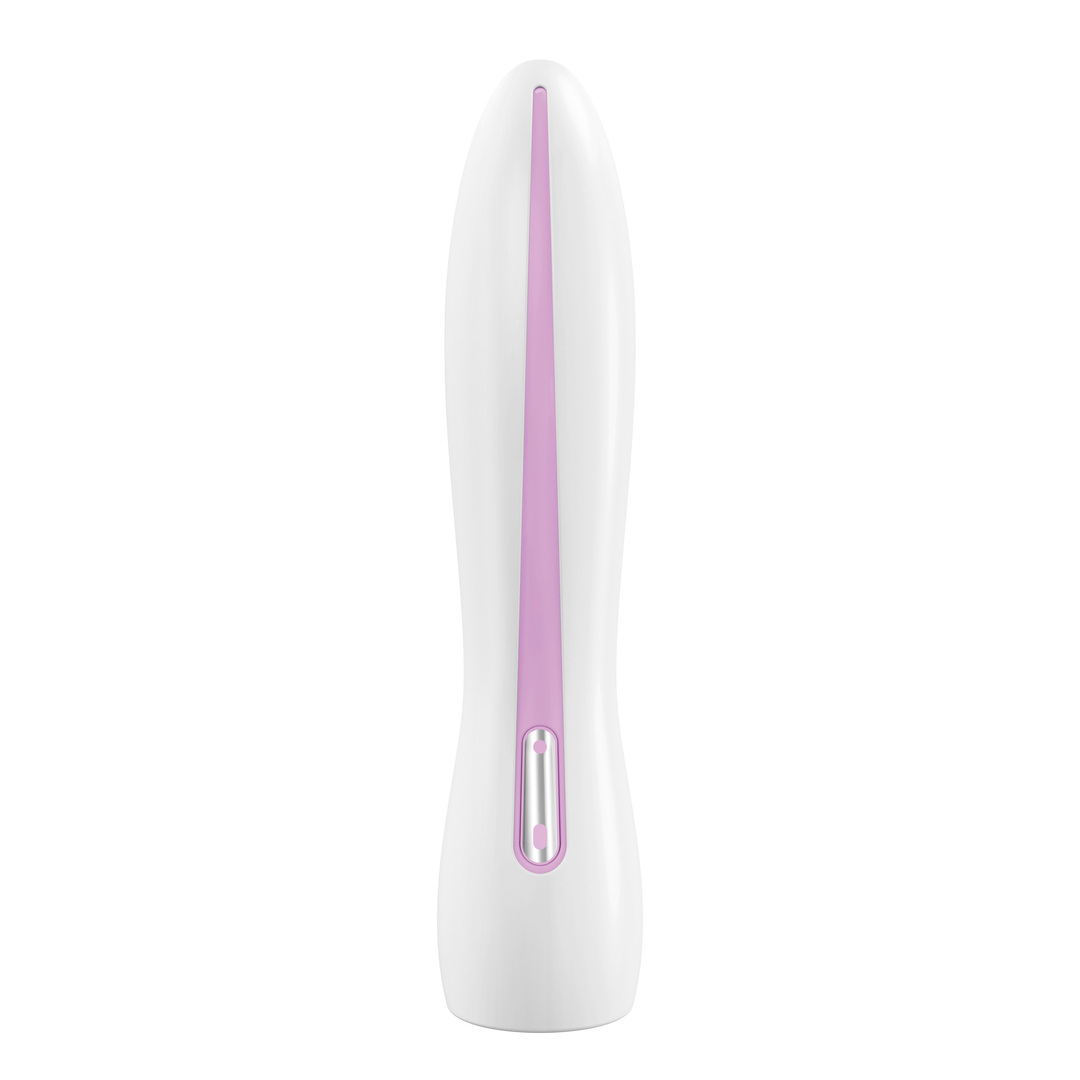 The design and the sensuously soft feel of the F4 are modelled after the female body. Gentle curves with an ergonomically shaped tip and a contrasting line emphasise the feminine design language. A variety of vibration levels can be selected individually on the striking, illuminated control element. The foot in its inverted form serves as a stand and also contains a securely closed battery compartment.