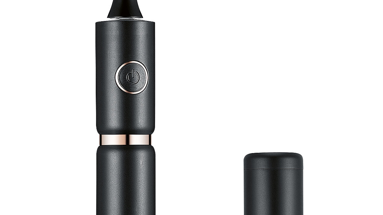 The modular design of this oral irrigator not only aids transport of the device, but also facilitates its stationary use. The water reservoir and handle can be taken apart and the handle can be put inside the reservoir which then acts as a travel case. To ensure hygienic use, the water is filtered as soon as the device is switched on. The water feed is integrated into the base of the device to improve stability and give the casing a coherent and neat appearance.