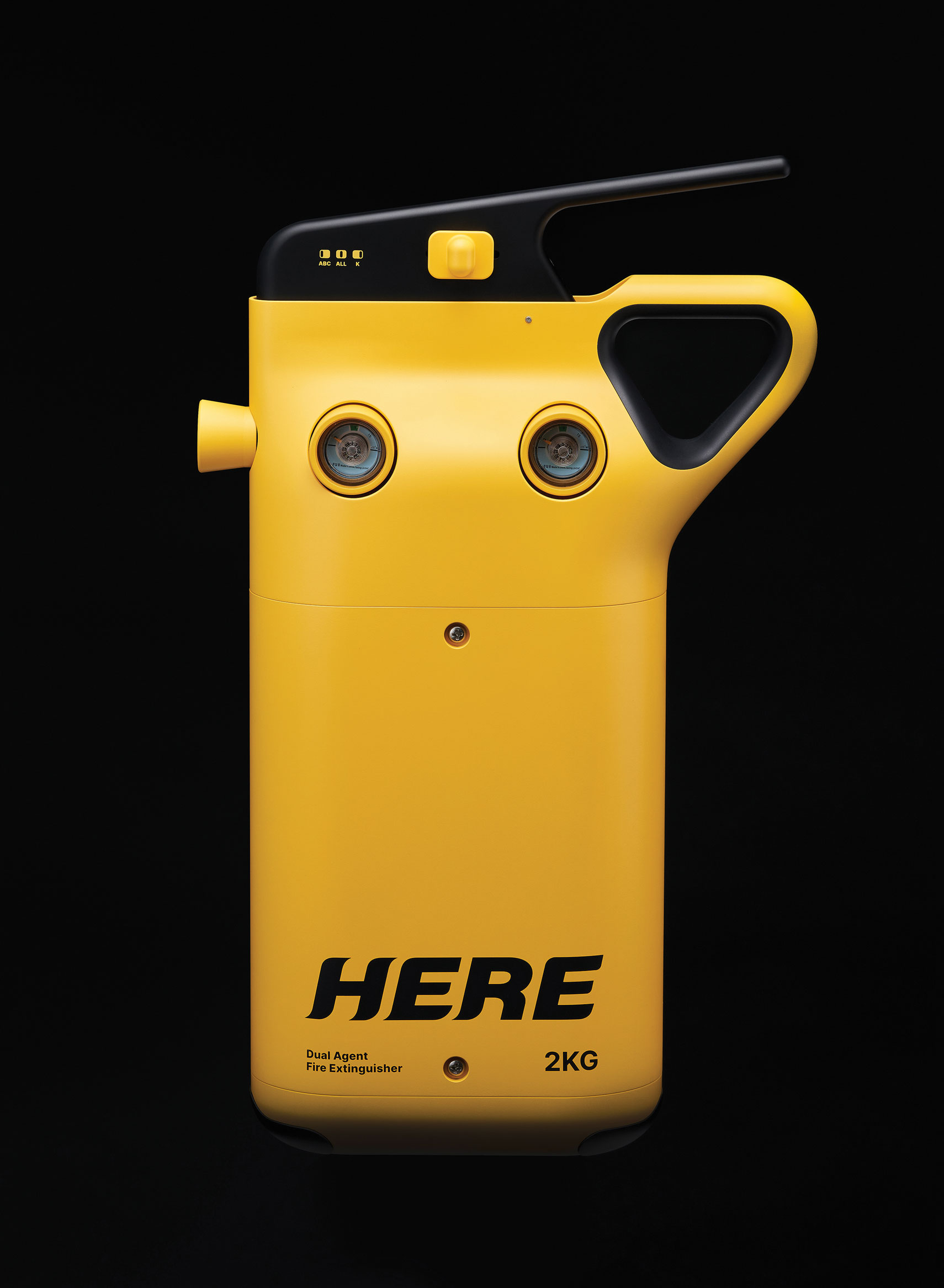 Standard fire extinguishers may be ineffective against certain fires, such as kitchen fires caused by overheated cooking oil. However, maintaining multiple extinguishers is impractical. To address this, an innovative extinguisher has been developed with two containers for different agents in a single unit. It combines ABC powder for general fires and a liquid agent for kitchen fires, enabling faster and more efficient suppression via a single lever. For enhanced fire safety, users can select the appropriate agent or discharge both simultaneously. Effective fire suppression requires at least 2 kilograms of extinguishing agent, which often results in bulky and heavy extinguisher units. As a solution, we prioritised user comfort, designing a grip suitable for all users. Extensive usability testing with 30 participants validated the design, confirming reduced strain on both wrist and back. Red Dot Award: Design Concept | Ready For Market | Safety, Protection and Security