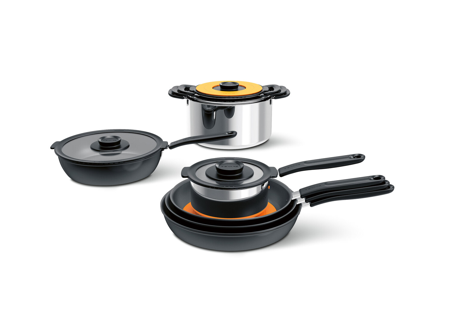 This cookware series has been designed for everyday cooking with a focus on ease of use and space-saving storage capability. All pots and pans are stackable, have dishwasher durability and are oven safe up to 150 degrees centigrade. The durable coating on the inside of the frying pan is PFOA-free, while the coating on the outside prevents scratches on glass hobs. The stainless steel pots transfer heat efficiently, while their bakelite handles remain cool, providing good grip.