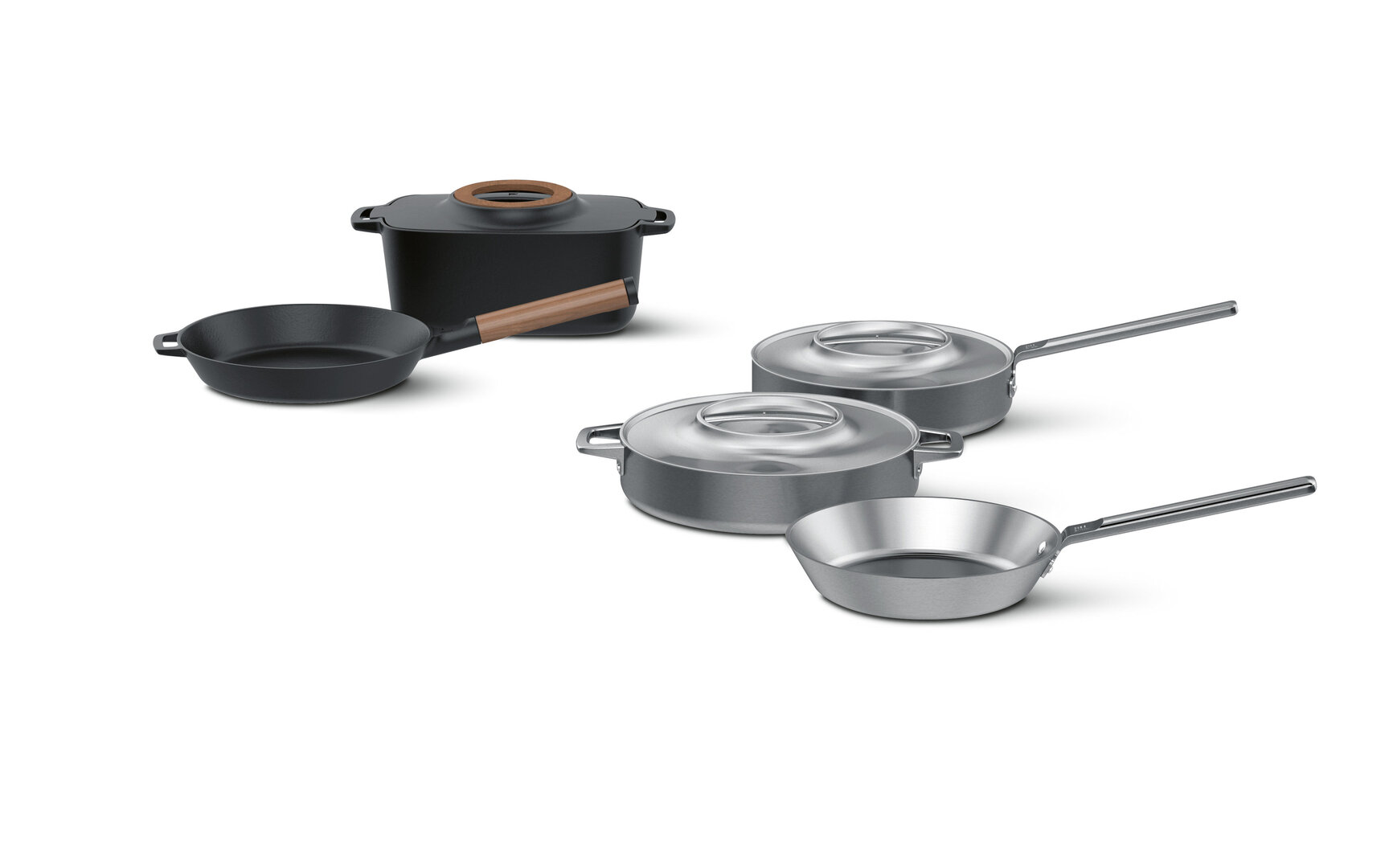This cookware series is inspired by Nordic cooking traditions. It was developed to achieve outstanding results at both high temperature frying and slow cooking of meals. A special mineral treatment gives the surface good non-stick properties. The cookware is available in two versions: one entirely made of stainless steel, the other made of cast-iron with wooden elements.