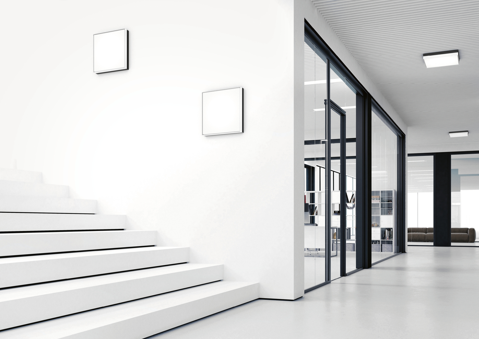 The design concept of this luminaire series is based on the clear geometry of a square. In addition, its reduced overall appearance is characterised by a distinctive black-and-white contrast. Flat Slim+ can be mounted as a pendant, ceiling or wall luminaire as required. Its weatherproof materials also suggest it for outdoor use. LED surface boards generate a homogeneous light, while the HF sensor and Bluetooth interface enable networking connectivity and comfortable app control.