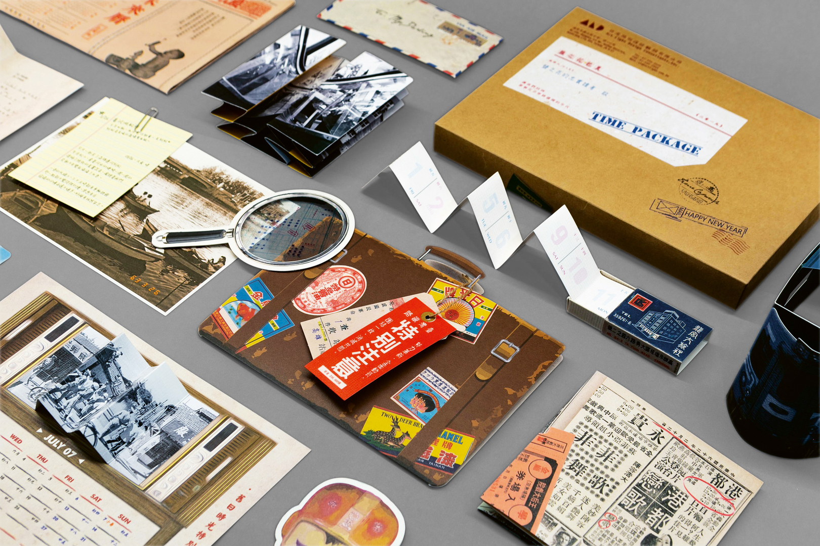 This calendar offers a narrative of life in the Yancheng district of Kaohsiung, Taiwan, in the 1950s. When opened, it reveals a treasure trove of delightful objects such as worn matchboxes, vintage suitcases, old maps, marbles and used toys. There is even a love letter, written by an American G.I. to his barmaid paramour, and, of course, an old newspaper. The varied design offers an emotionally appealing experience each month by discovering representative items from this bygone era. The concept has an interactive gearing which encourages users to engage with the calendar and to explore the context of the period for themselves.