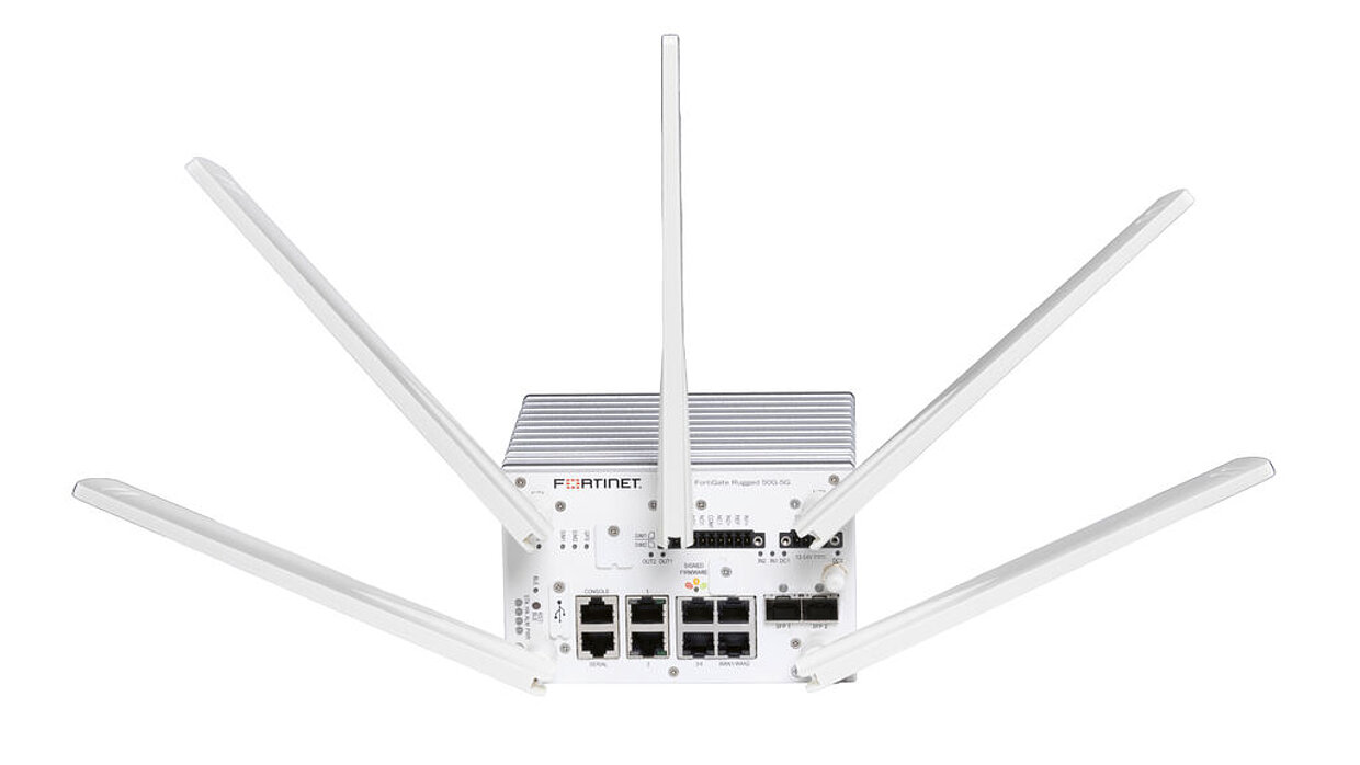 The appearance of the FortiGate Rugged 70G-5G Dual underscores its reliability, with nine imposing antennas and multiple connection options.